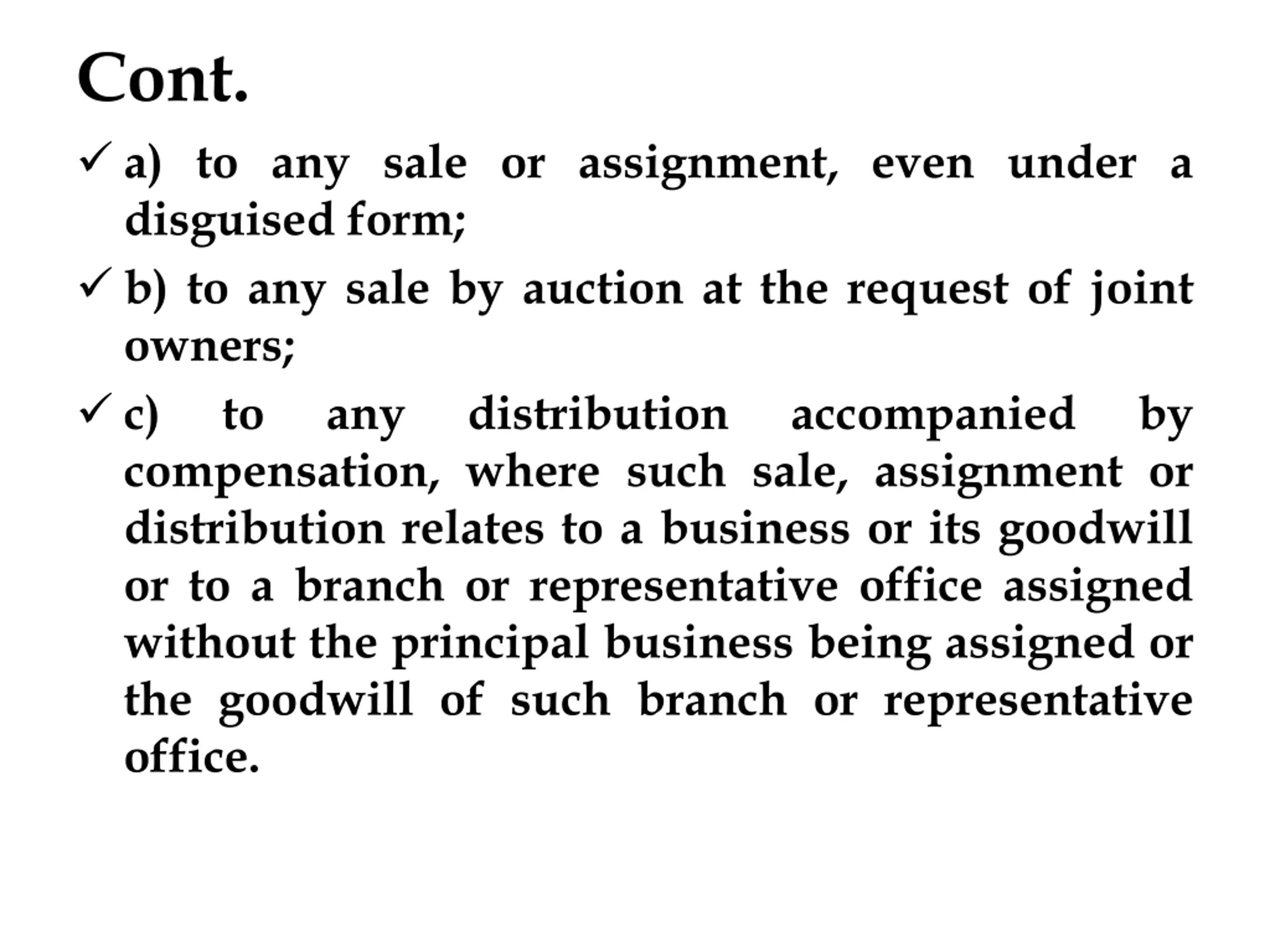 Cont. a) to any sale or assignment, even under a disguised form; b) to any sale by auction at the request of joint owners; c) to any distribution compensation, where such sale, assignment or distribution relates to a business or its goodwill or to a branch or representative office assigned without the principal business being assigned or the goodwill of such branch or representative office. accompanied by