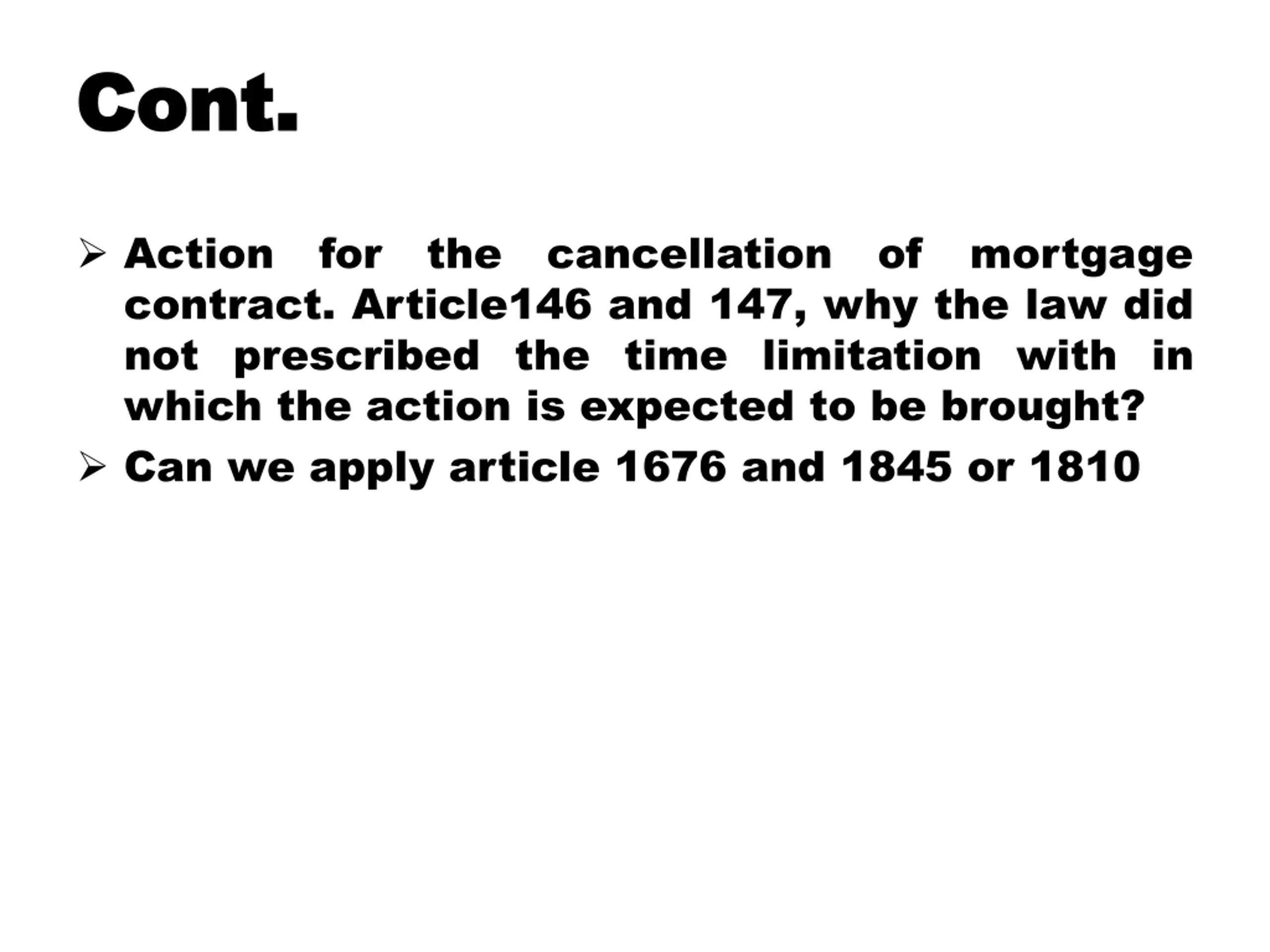 Cont Cont. . Action contract. Article146 and 147, why the law did not prescribed the time limitation with in which the action is expected to be brought? Can we apply article 1676 and 1845 or 1810 for the cancellation of mortgage