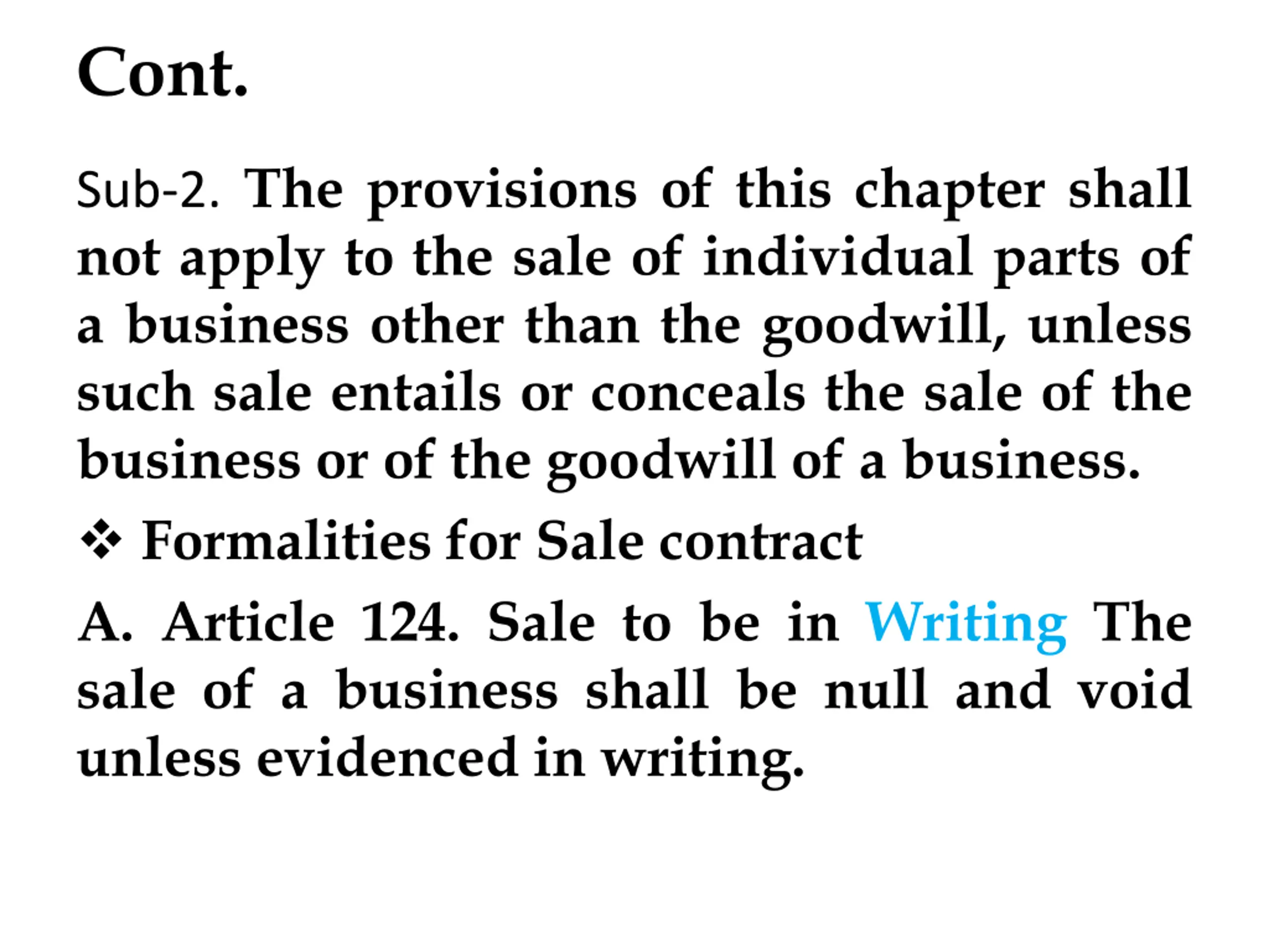 Cont. Sub-2. The provisions of this chapter shall not apply to the sale of individual parts of a business other than the goodwill, unless such sale entails or conceals the sale of the business or of the goodwill of a business. Formalities for Sale contract A. Article 124. Sale to be in Writing The sale of a business shall be null and void unless evidenced in writing.
