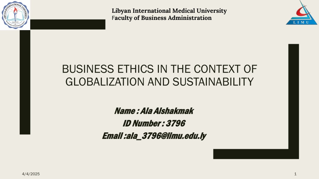 Libyan International Medical University Faculty of Business Administration BUSINESS ETHICS IN THE CONTEXT OF GLOBALIZATION AND SUSTAINABILITY Name : Ala Alshakmak Name : Ala Alshakmak ID Number : 3796 ID Number : 3796 Email :ala_3796@limu.edu.ly Email :ala_3796@limu.edu.ly 4/4/2025 1