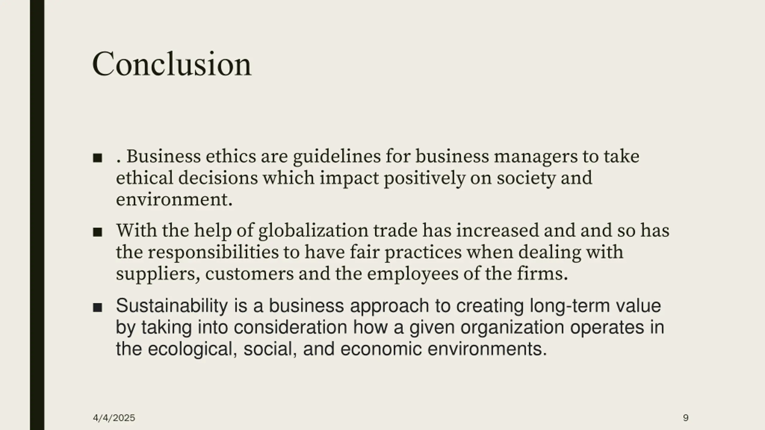 Conclusion . Business ethics are guidelines for business managers to take ethical decisions which impact positively on society and environment. With the help of globalization trade has increased and and so has the responsibilities to have fair practices when dealing with suppliers, customers and the employees of the firms. Sustainability is a business approach to creating long-term value by taking into consideration how a given organization operates in the ecological, social, and economic environments. 4/4/2025 9