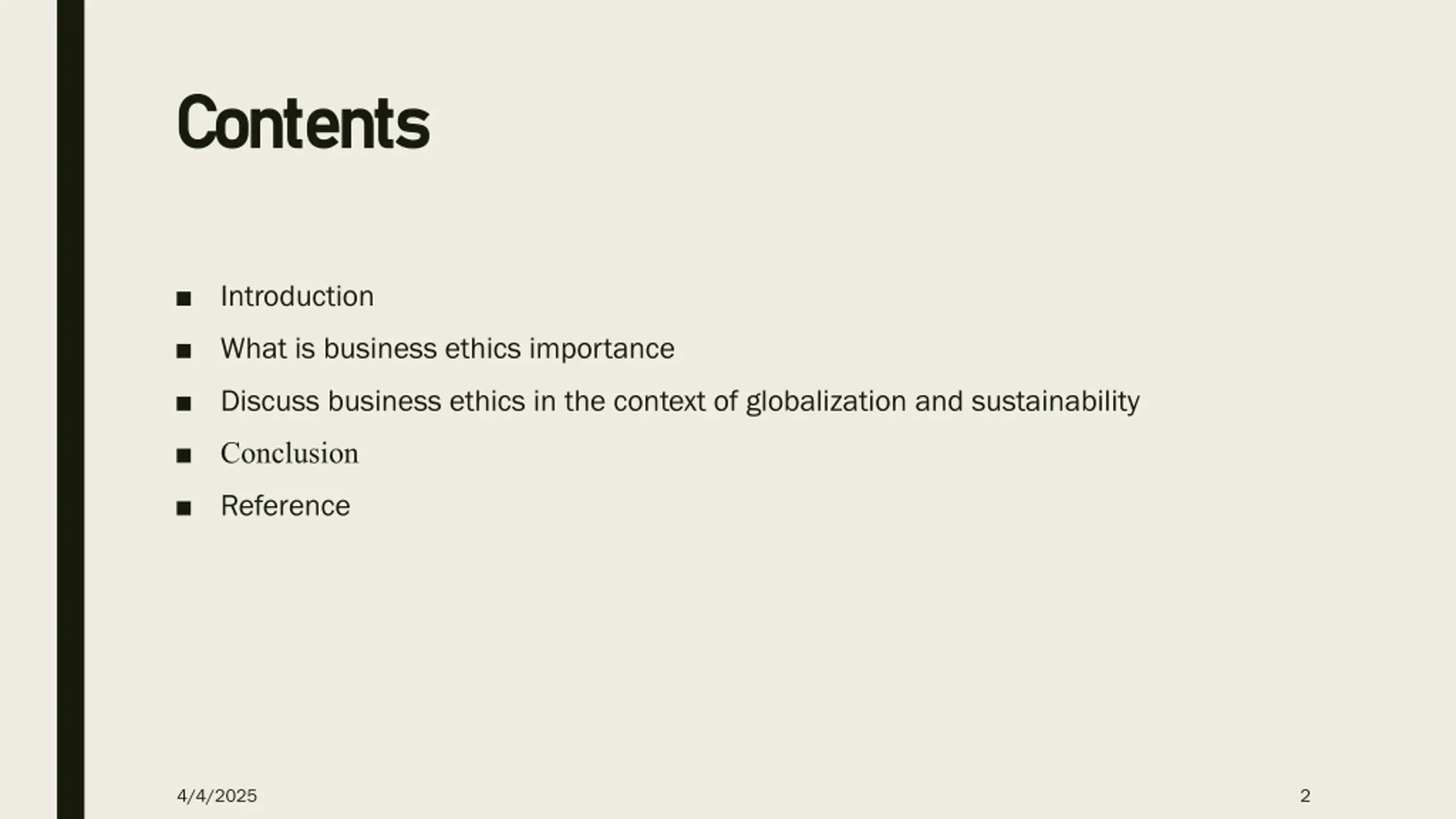 Contents Contents Introduction What is business ethics importance Discuss business ethics in the context of globalization and sustainability Conclusion Reference 4/4/2025 2