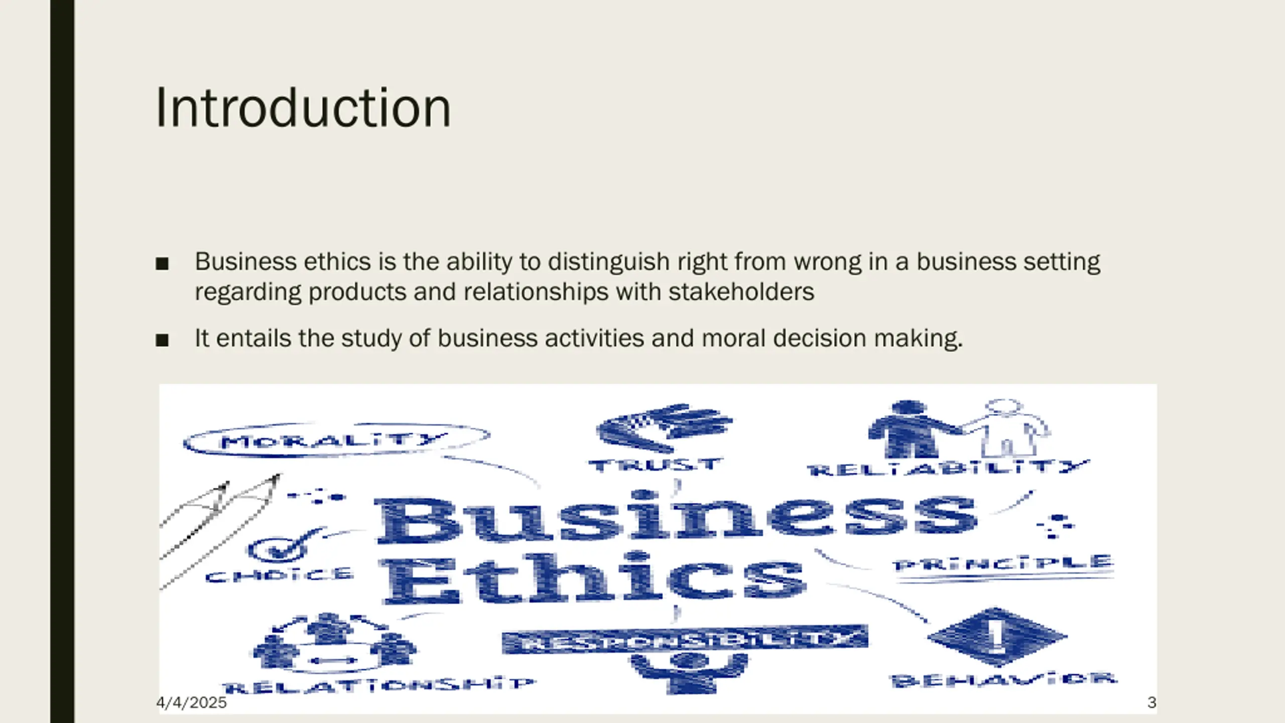 Introduction Business ethics is the ability to distinguish right from wrong in a business setting regarding products and relationships with stakeholders It entails the study of business activities and moral decision making. 4/4/2025 3