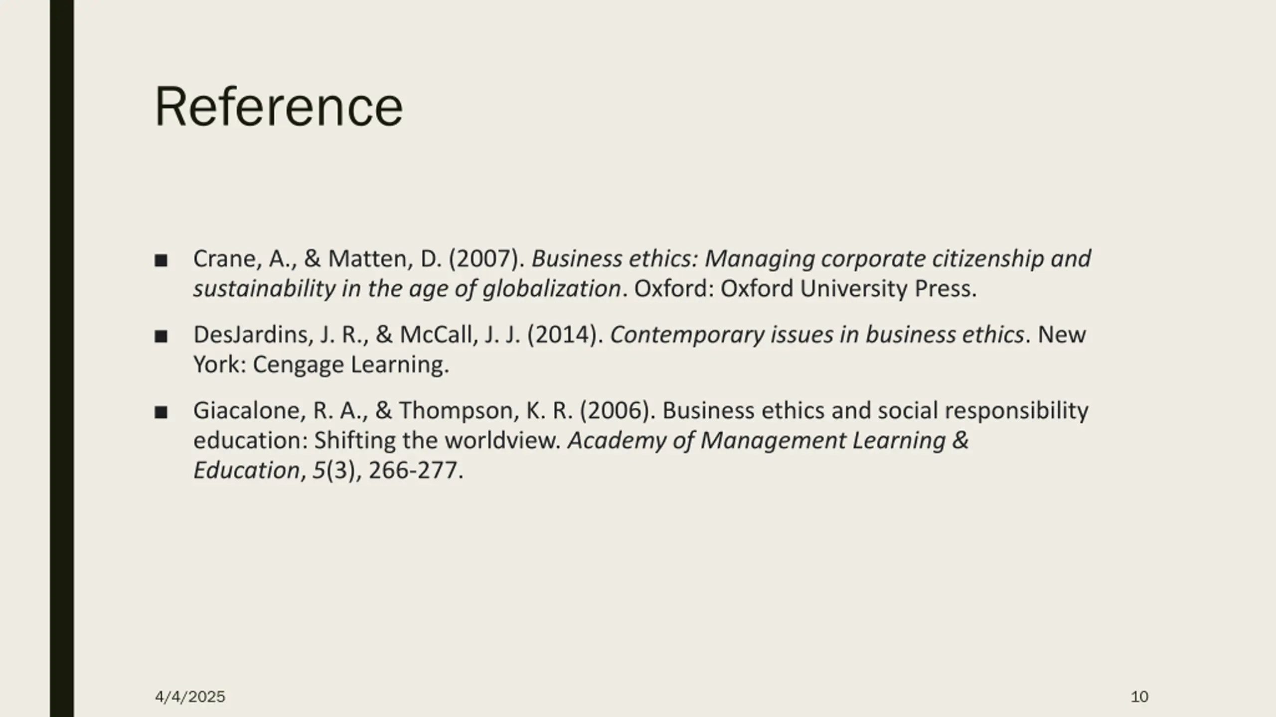 Reference Crane, A., & Matten, D. (2007). Business ethics: Managing corporate citizenship and sustainability in the age of globalization. Oxford: Oxford University Press. DesJardins, J. R., & McCall, J. J. (2014). Contemporary issues in business ethics. New York: Cengage Learning. Giacalone, R. A., & Thompson, K. R. (2006). Business ethics and social responsibility education: Shifting the worldview. Academy of Management Learning & Education, 5(3), 266-277. 4/4/2025 10