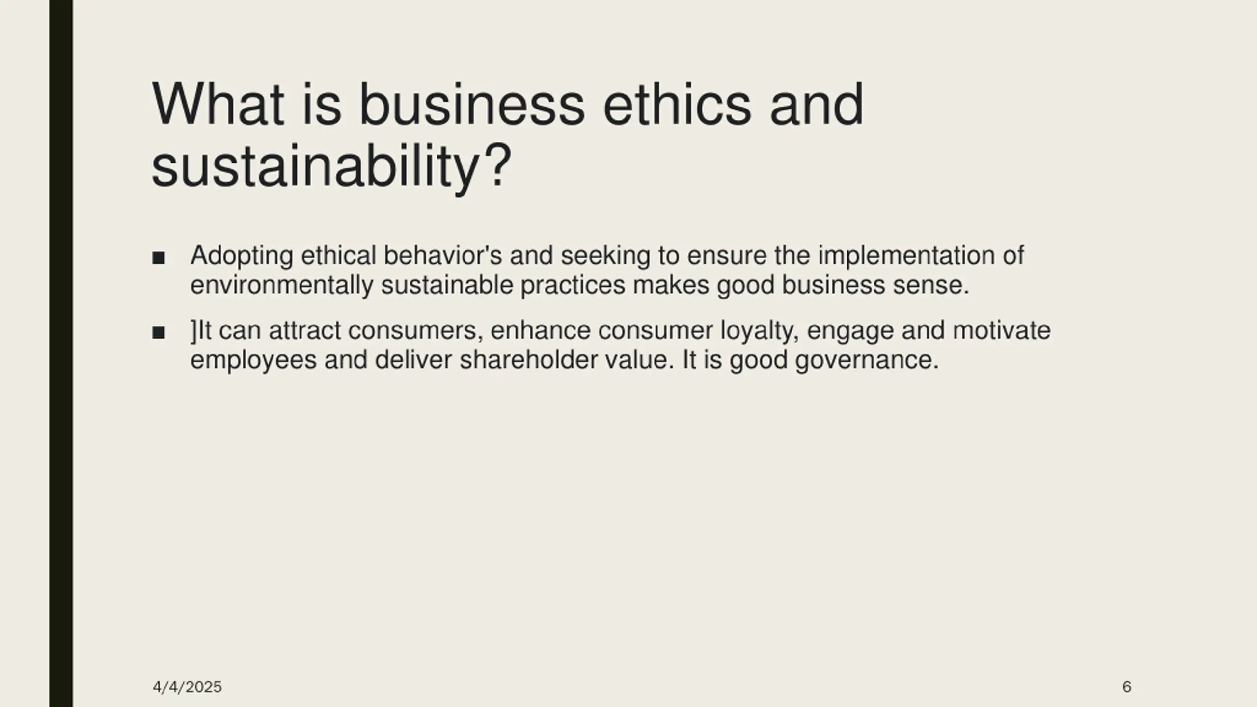 What is business ethics and sustainability? Adopting ethical behavior's and seeking to ensure the implementation of environmentally sustainable practices makes good business sense. ]It can attract consumers, enhance consumer loyalty, engage and motivate employees and deliver shareholder value. It is good governance. 4/4/2025 6