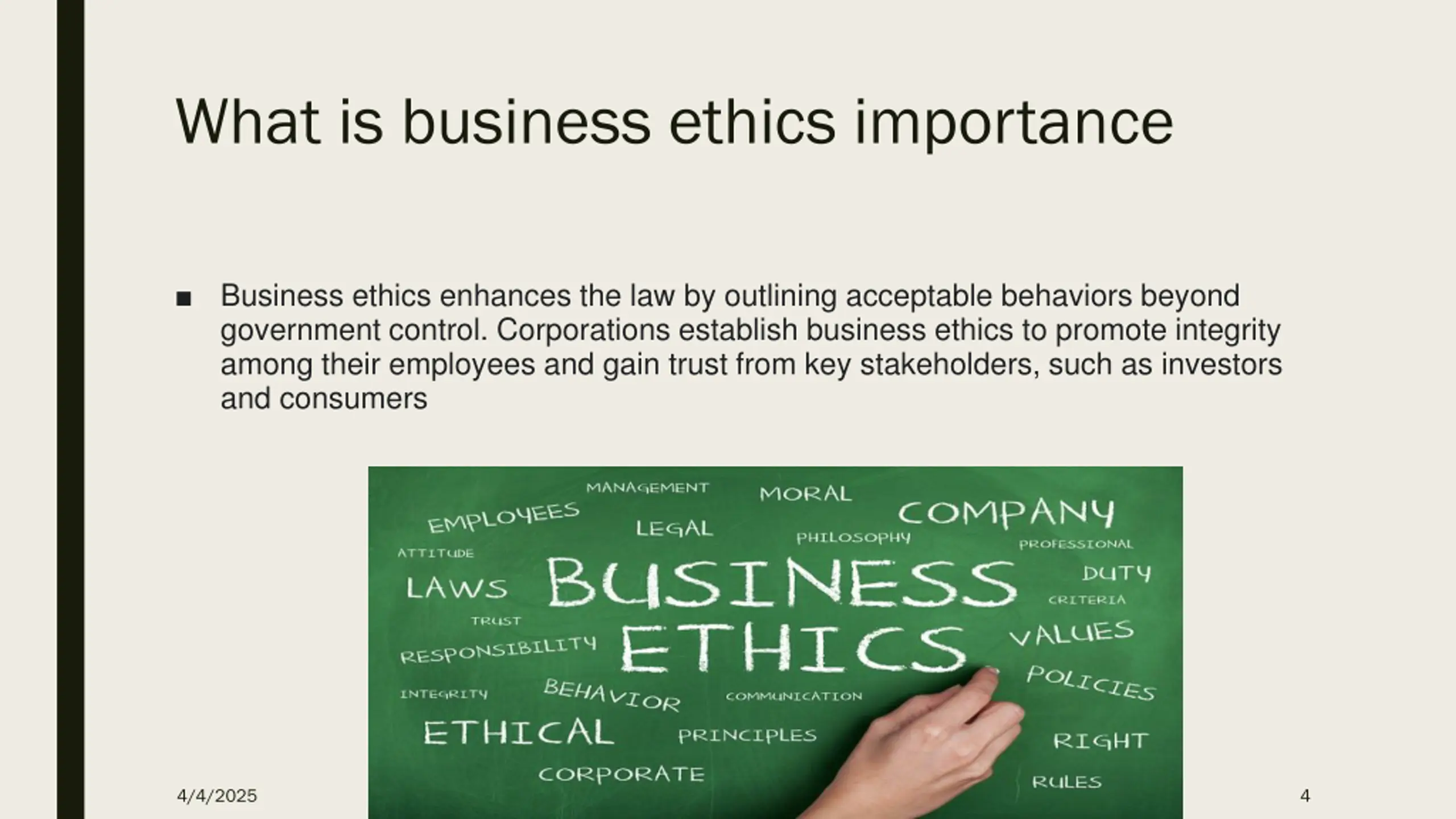 What is business ethics importance Business ethics enhances the law by outlining acceptable behaviors beyond government control. Corporations establish business ethics to promote integrity among their employees and gain trust from key stakeholders, such as investors and consumers 4/4/2025 4