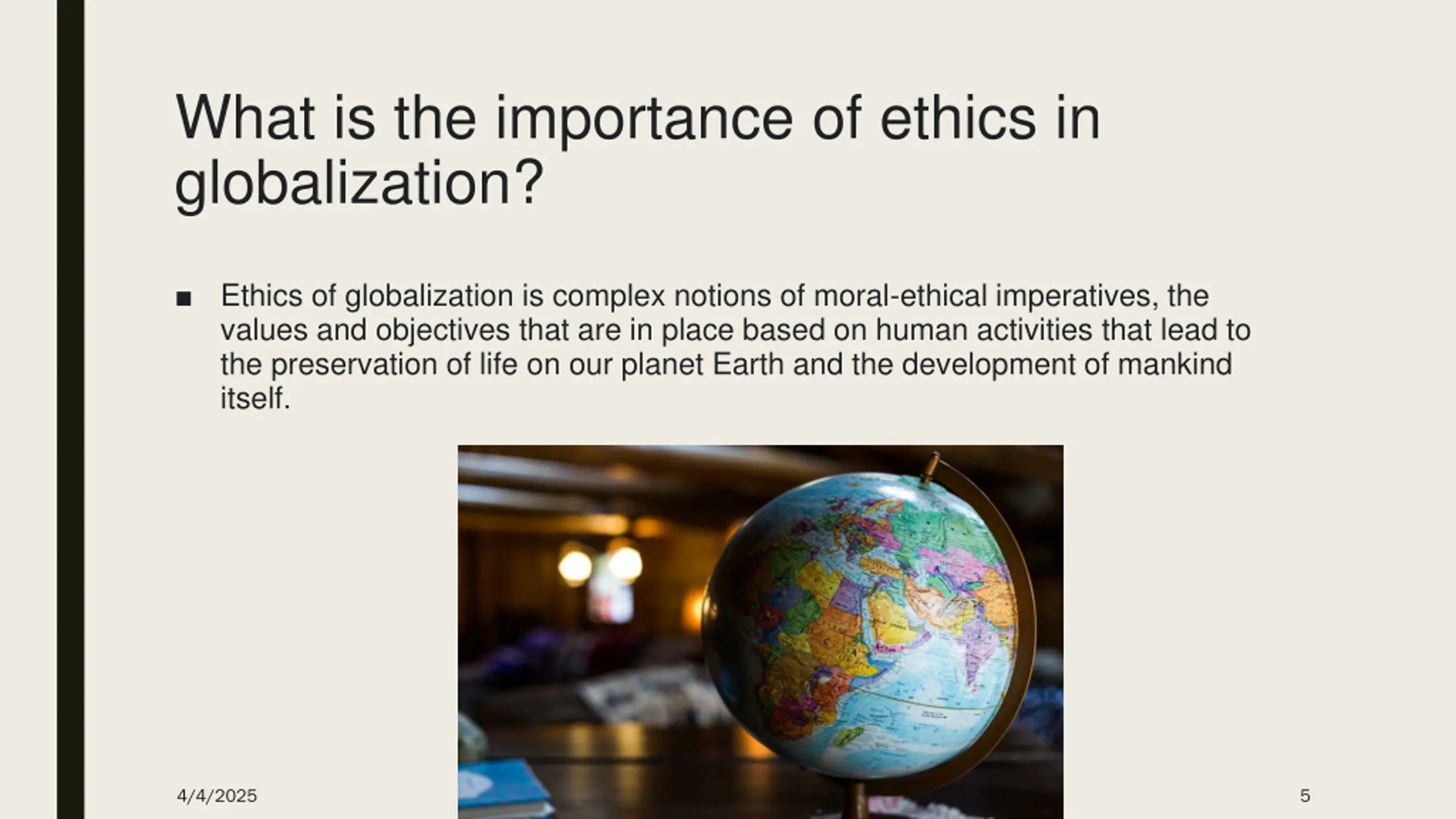 What is the importance of ethics in globalization? Ethics of globalization is complex notions of moral-ethical imperatives, the values and objectives that are in place based on human activities that lead to the preservation of life on our planet Earth and the development of mankind itself. 4/4/2025 5