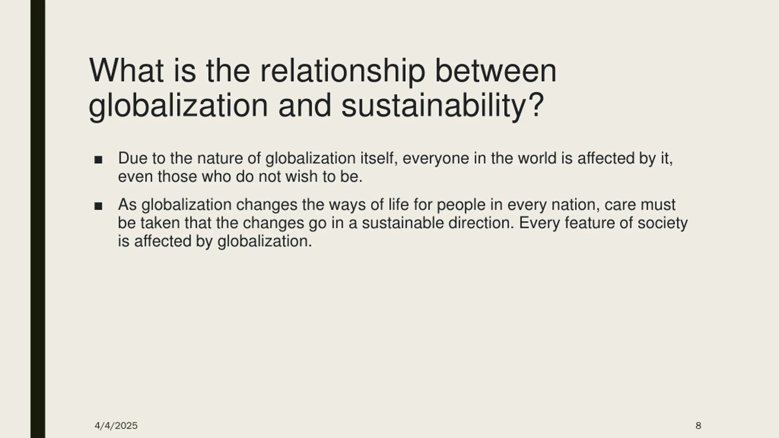 What is the relationship between globalization and sustainability? Due to the nature of globalization itself, everyone in the world is affected by it, even those who do not wish to be. As globalization changes the ways of life for people in every nation, care must be taken that the changes go in a sustainable direction. Every feature of society is affected by globalization. 4/4/2025 8