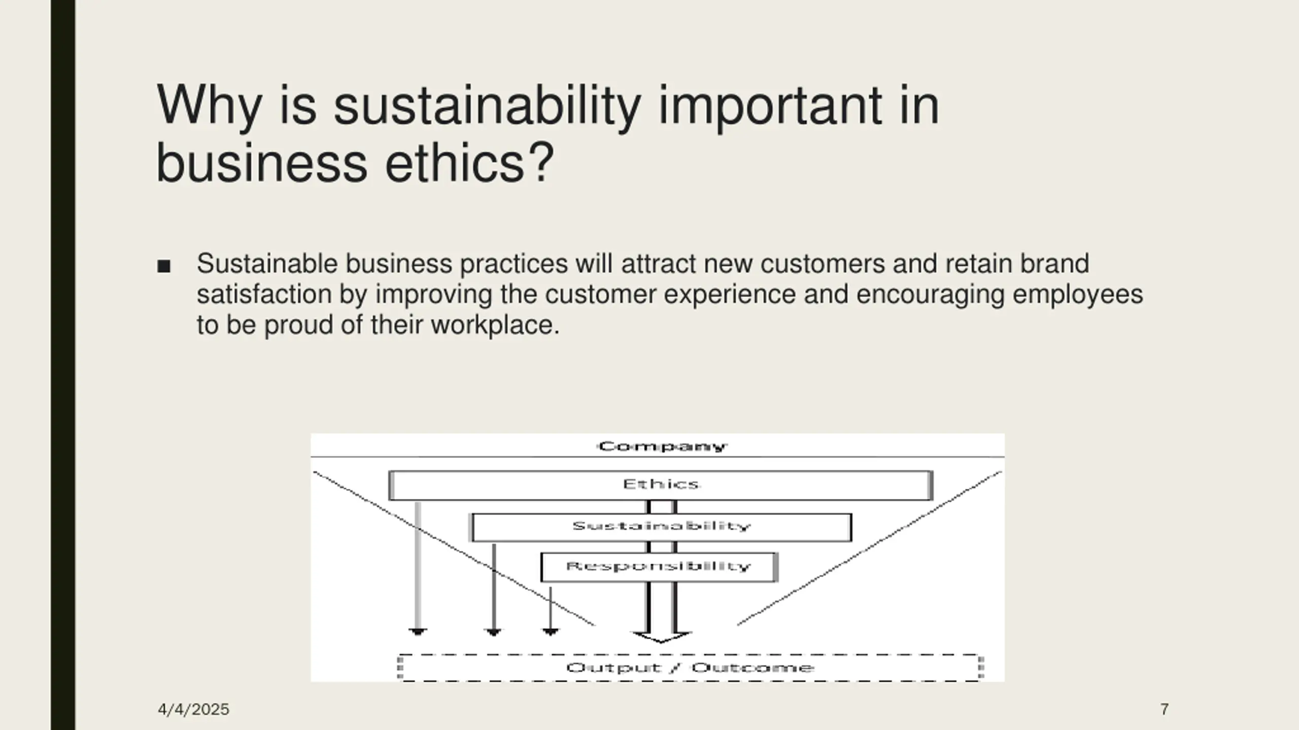 Why is sustainability important in business ethics? Sustainable business practices will attract new customers and retain brand satisfaction by improving the customer experience and encouraging employees to be proud of their workplace. 4/4/2025 7