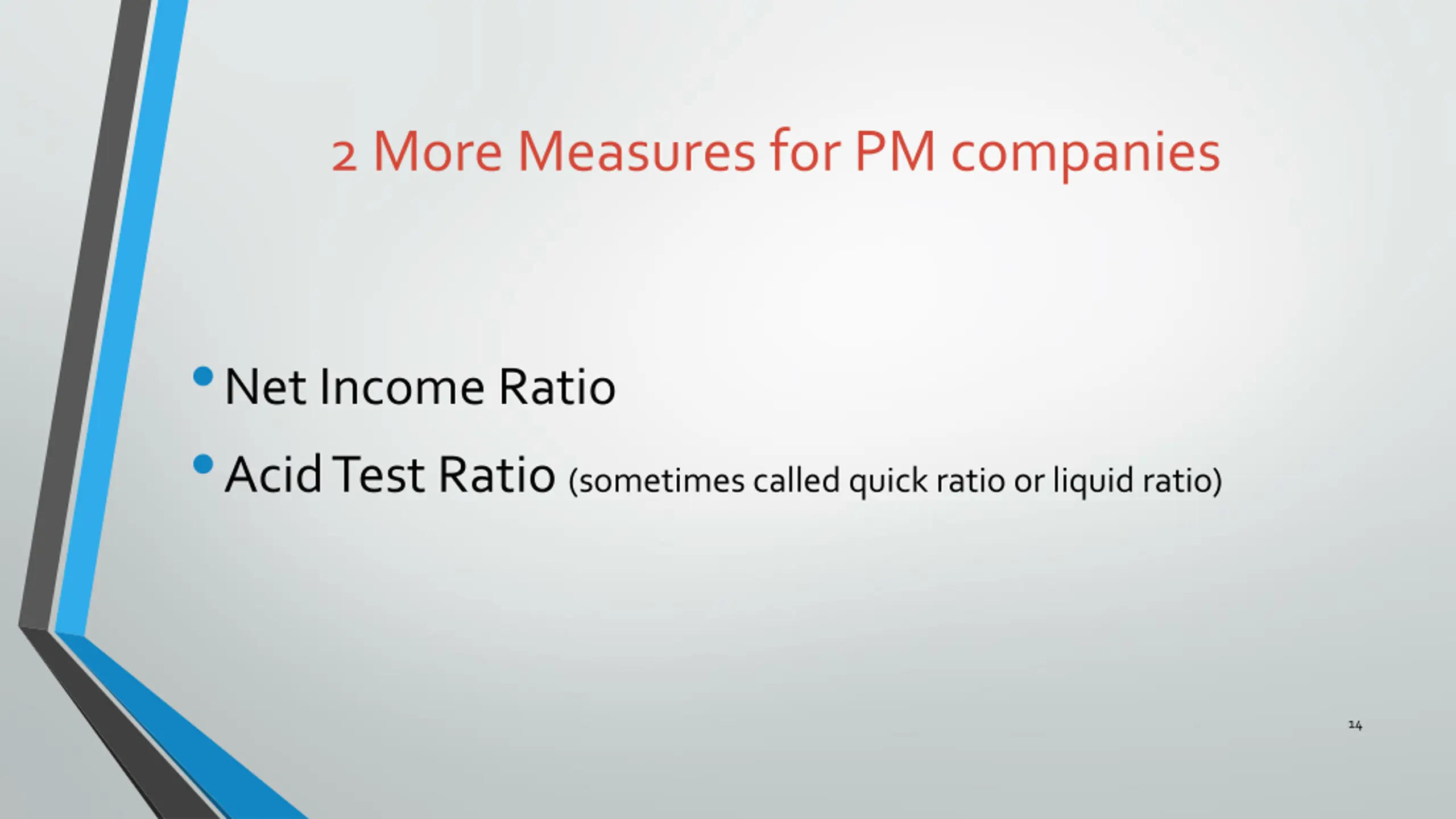 2 More Measures for PM companies Net Income Ratio Acid Test Ratio (sometimes called quick ratio or liquid ratio) 14