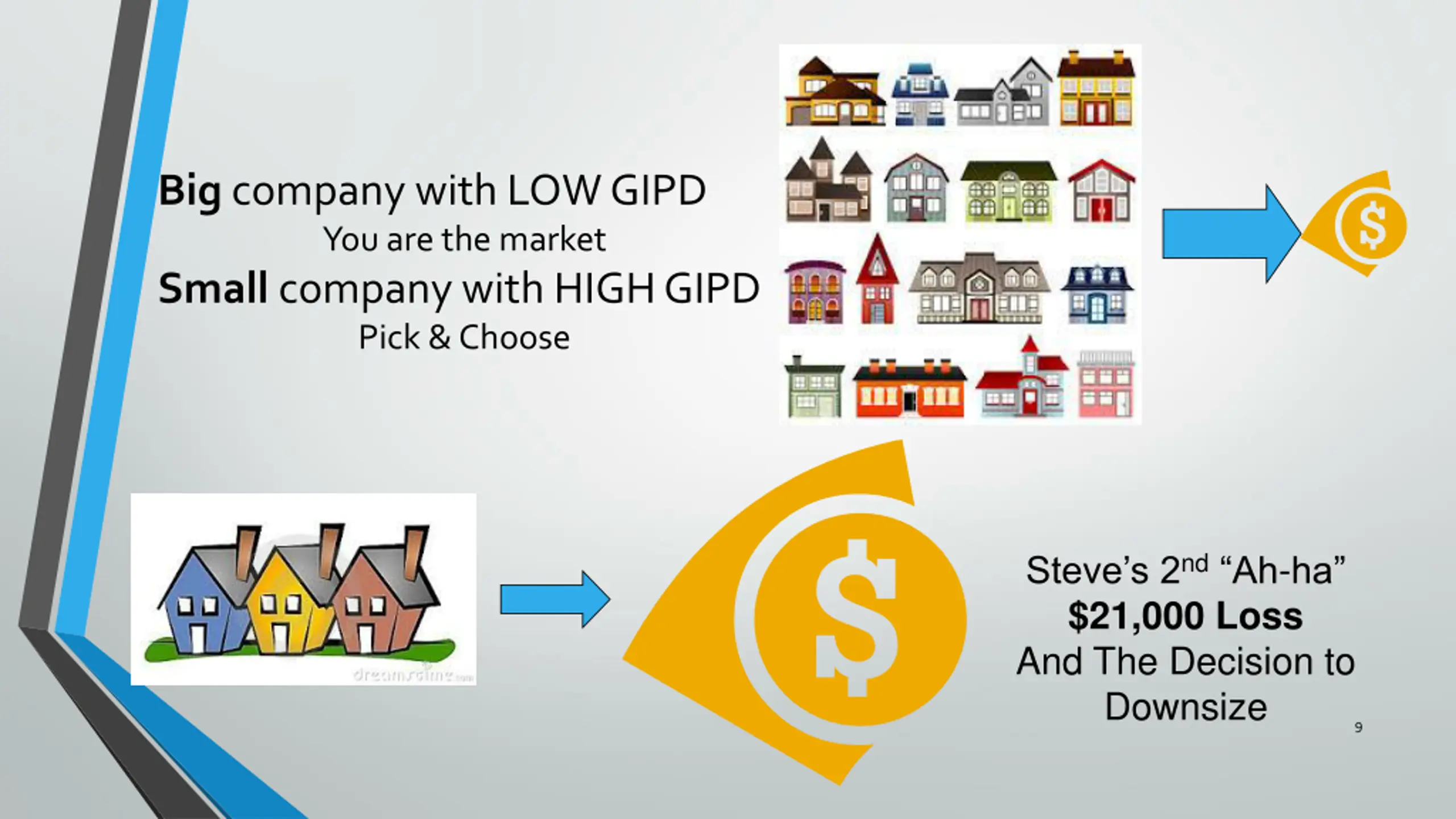 Big company with LOW GIPD You are the market Small company with HIGH GIPD Pick & Choose Steve s 2nd Ah-ha $21,000 Loss And The Decision to Downsize 9