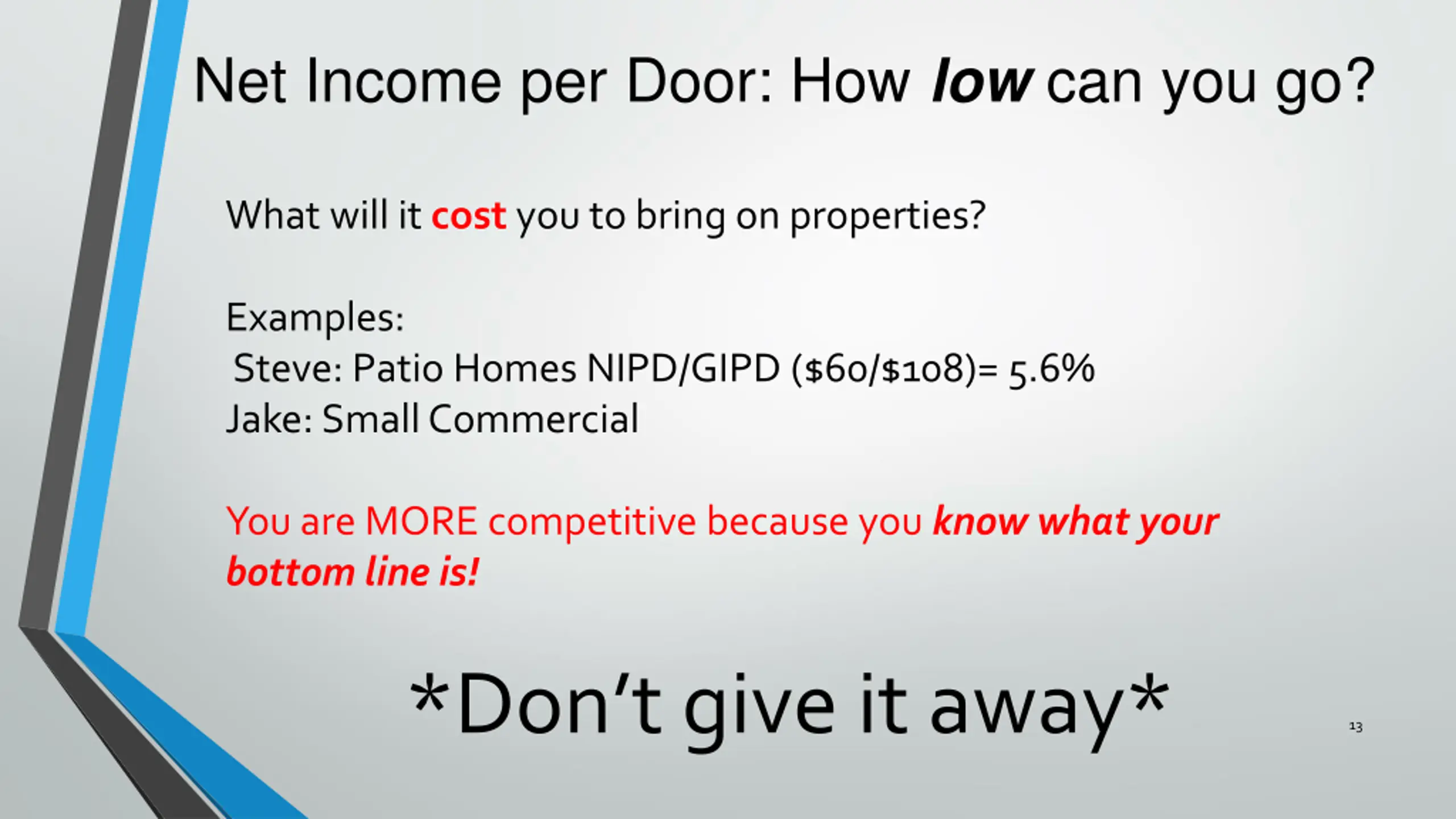 Net Income per Door: How low can you go? What will it cost you to bring on properties? Examples: Steve: Patio Homes NIPD/GIPD ($60/$108)= 5.6% Jake: Small Commercial You are MORE competitive because you know what your bottom line is! *Don t give it away* 13