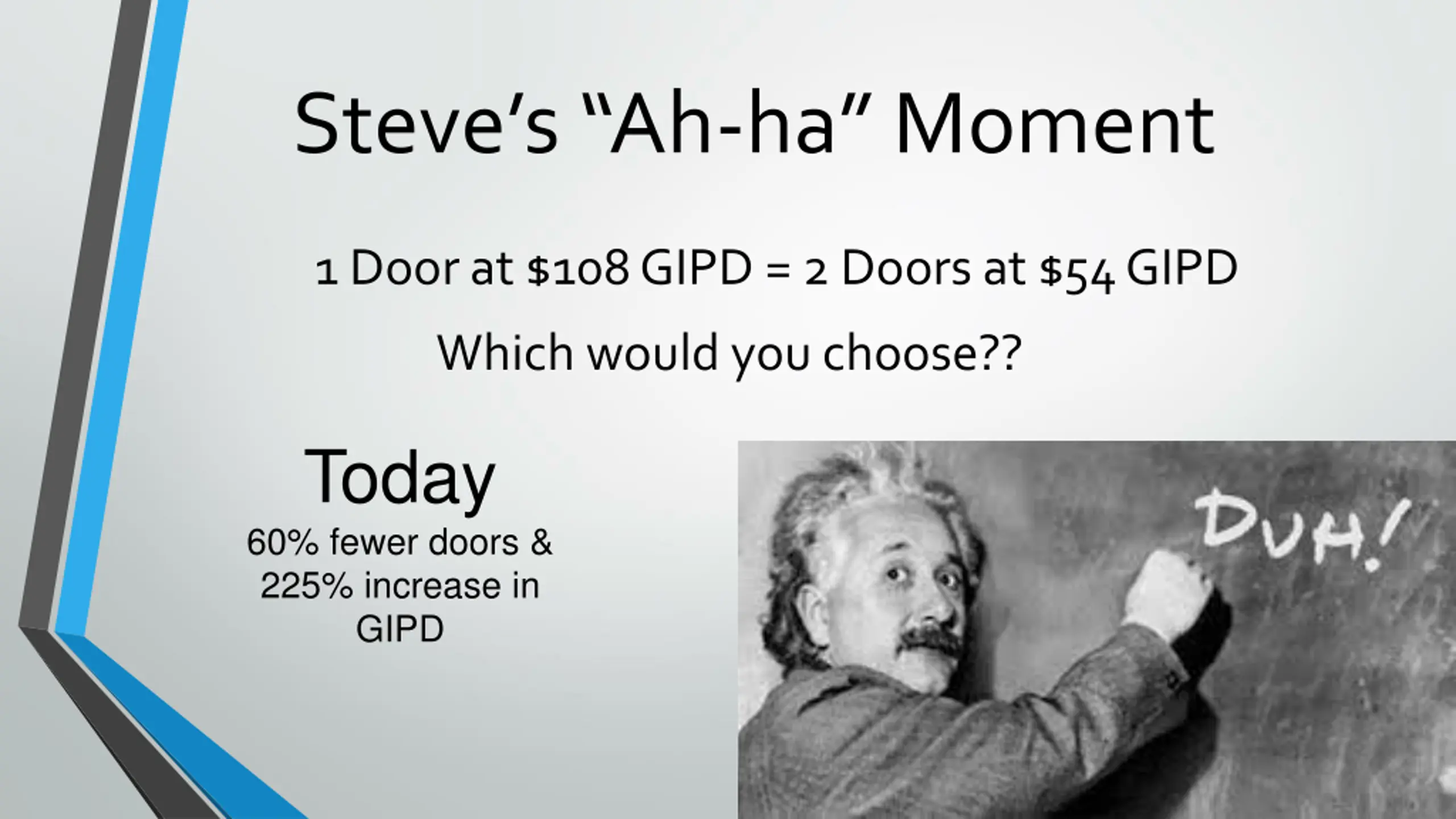 Steves Ah-ha Moment 1 Door at $108 GIPD = 2 Doors at $54 GIPD Which would you choose?? Today 60% fewer doors & 225% increase in GIPD 8