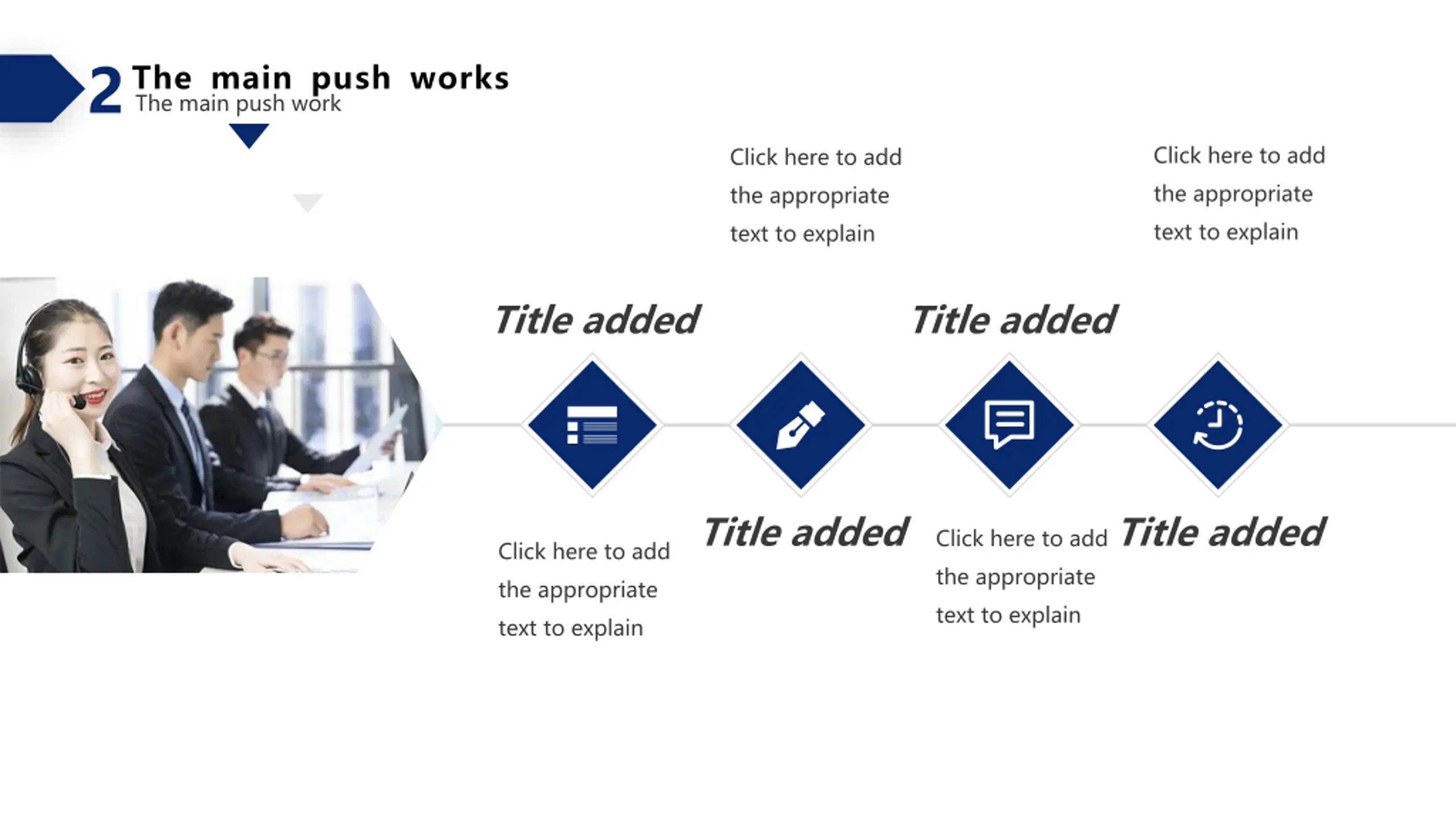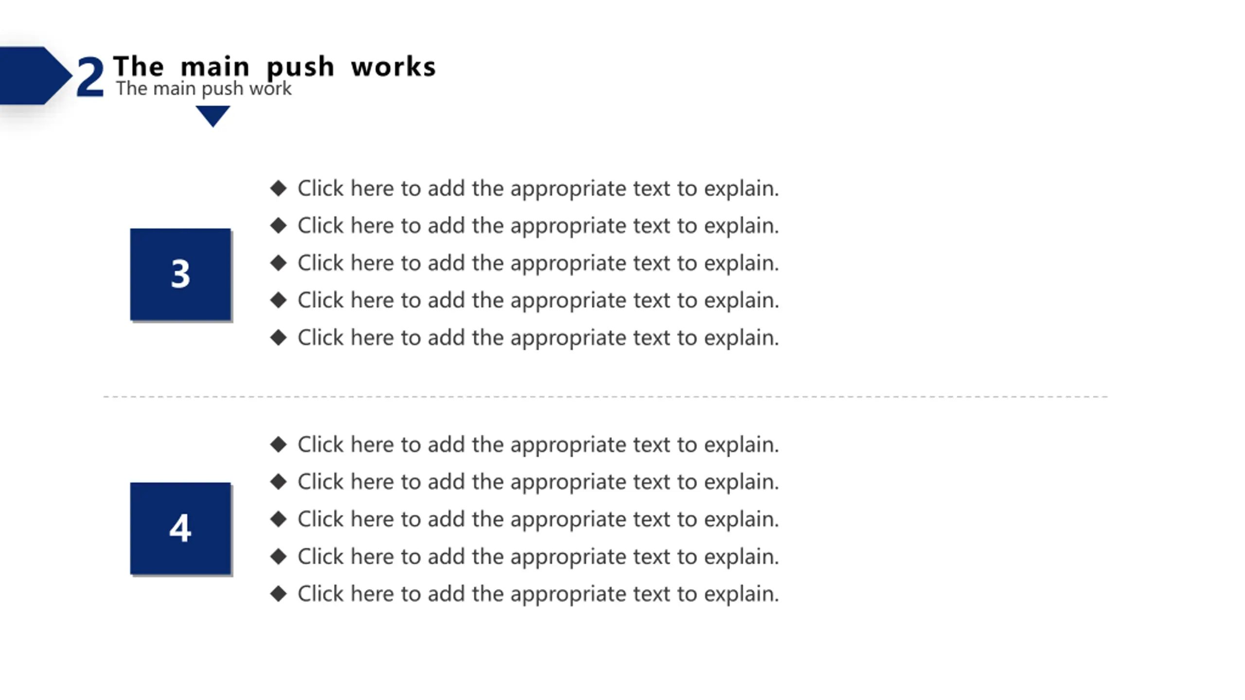 2 The main push works The main push work Click here to add the appropriate text to explain. Click here to add the appropriate text to explain. Click here to add the appropriate text to explain. Click here to add the appropriate text to explain. Click here to add the appropriate text to explain. 3 Click here to add the appropriate text to explain. Click here to add the appropriate text to explain. Click here to add the appropriate text to explain. Click here to add the appropriate text to explain. Click here to add the appropriate text to explain. 4