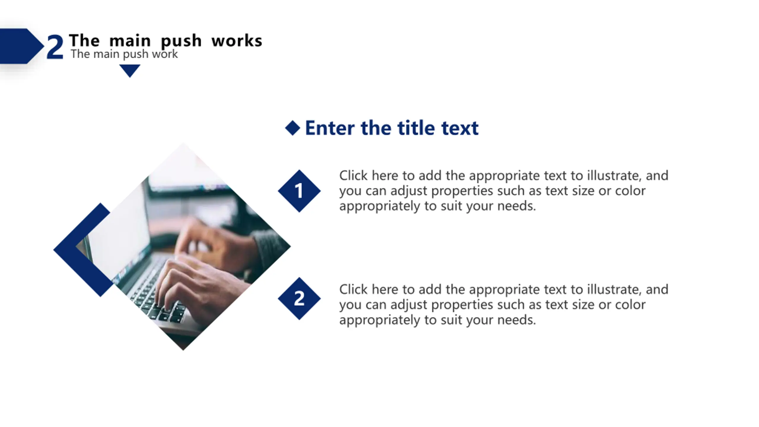 2 The main push works The main push work Enter the title text Enter the title text 2 Click here to add the appropriate text to illustrate, and you can adjust properties such as text size or color appropriately to suit your needs.