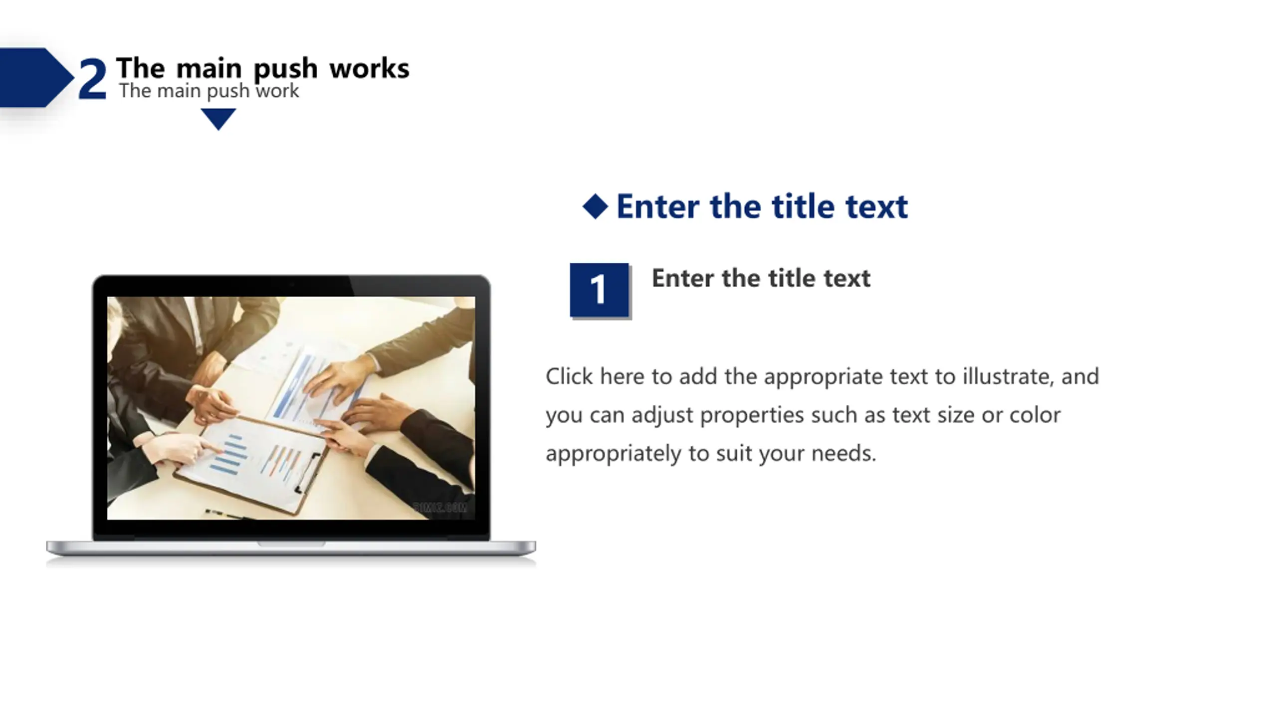 2 The main push works The main push work Enter the title text Enter the title text 1 Click here to add the appropriate text to illustrate, and you can adjust properties such as text size or color appropriately to suit your needs.