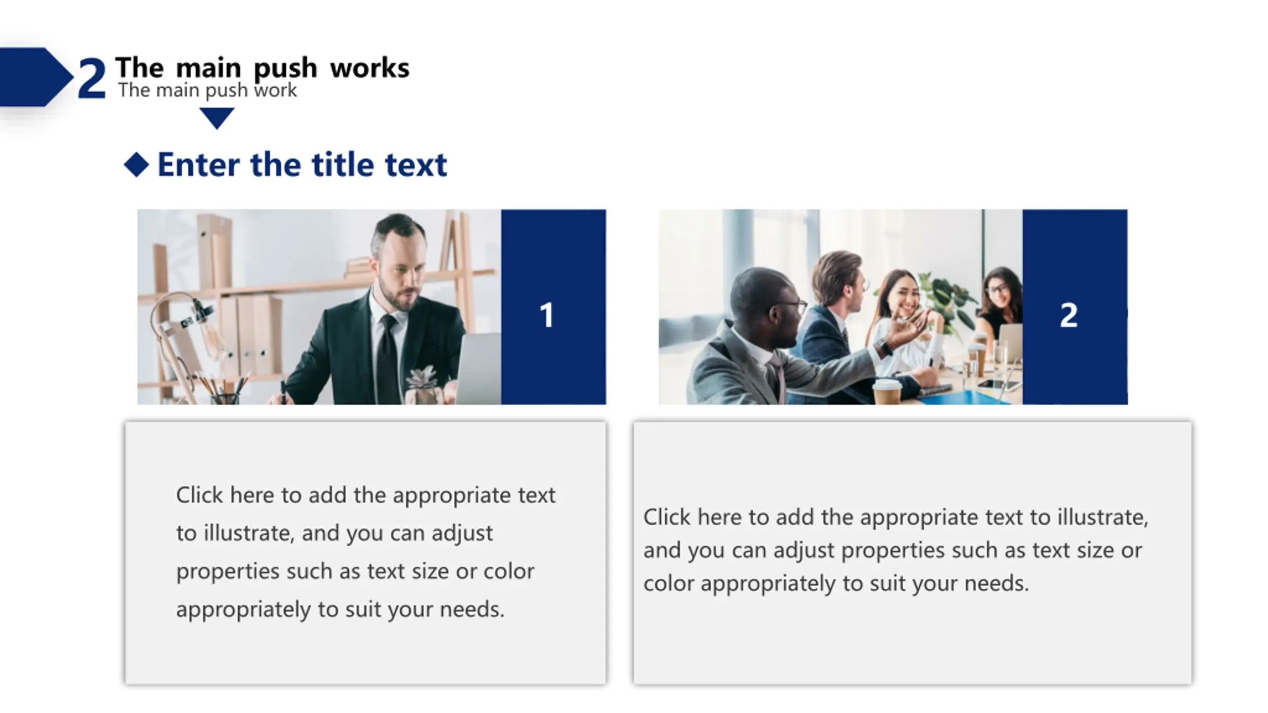 2 The main push works The main push work Enter the title text Click here to add the appropriate text to illustrate, and you can adjust properties such as text size or color appropriately to suit your needs. 1 Click here to add the appropriate text to illustrate, and you can adjust properties such as text size or color appropriately to suit your needs. 2