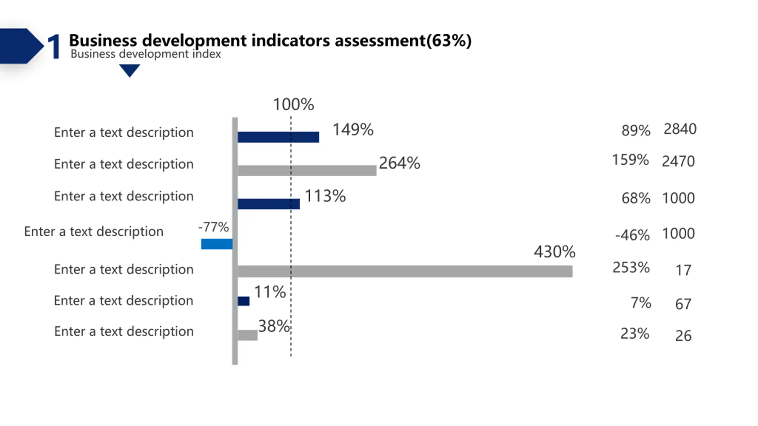 1 Business development indicators assessment(63%) Business development index 100% 149% 2840 89% Enter a text description 159% 2470 264% Enter a text description 113% Enter a text description 68% 1000 -77% Enter a text description 1000 -46% 430% 253% 17 Enter a text description 11% Enter a text description 7% 67 38% Enter a text description 23% 26
