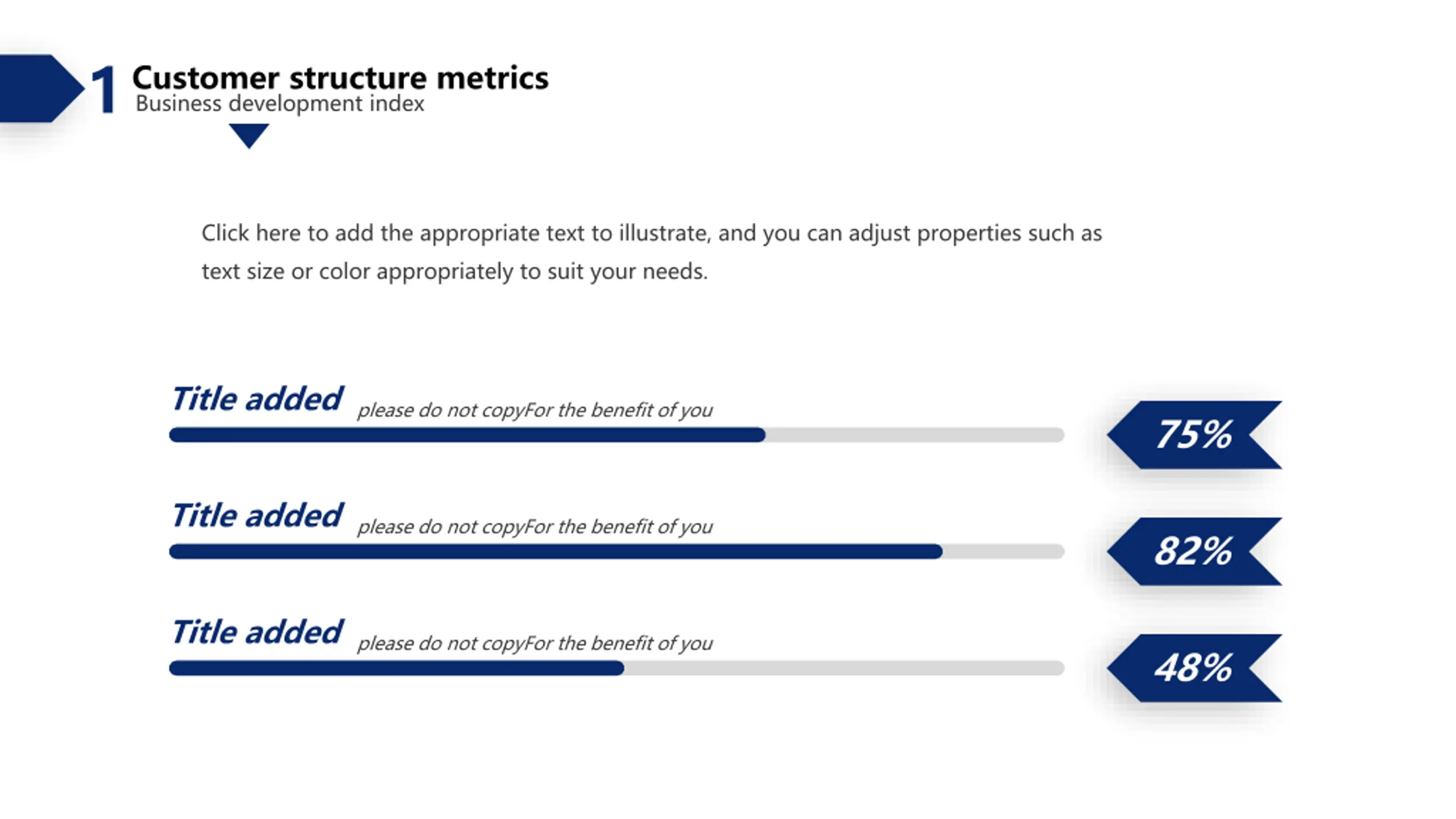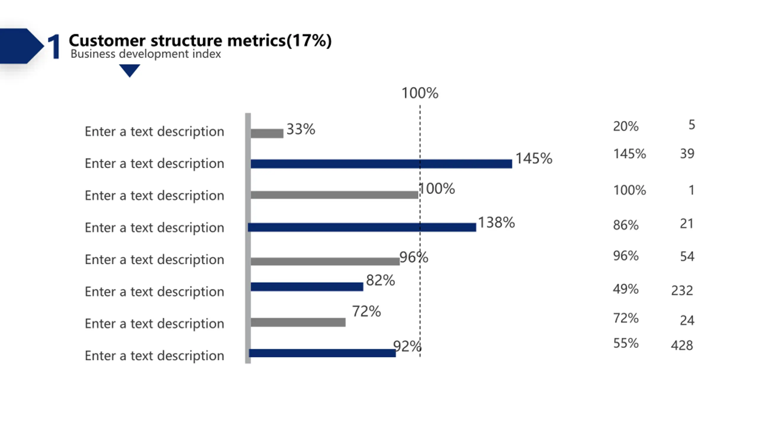 1 Customer structure metrics(17%) Business development index 100% 5 20% 33% Enter a text description 39 145% 145% Enter a text description 100% 100% 1 Enter a text description 138% 21 86% Enter a text description 96% 96% 54 Enter a text description 82% 49% 232 Enter a text description 72% 72% 24 Enter a text description 55% 92% 428 Enter a text description