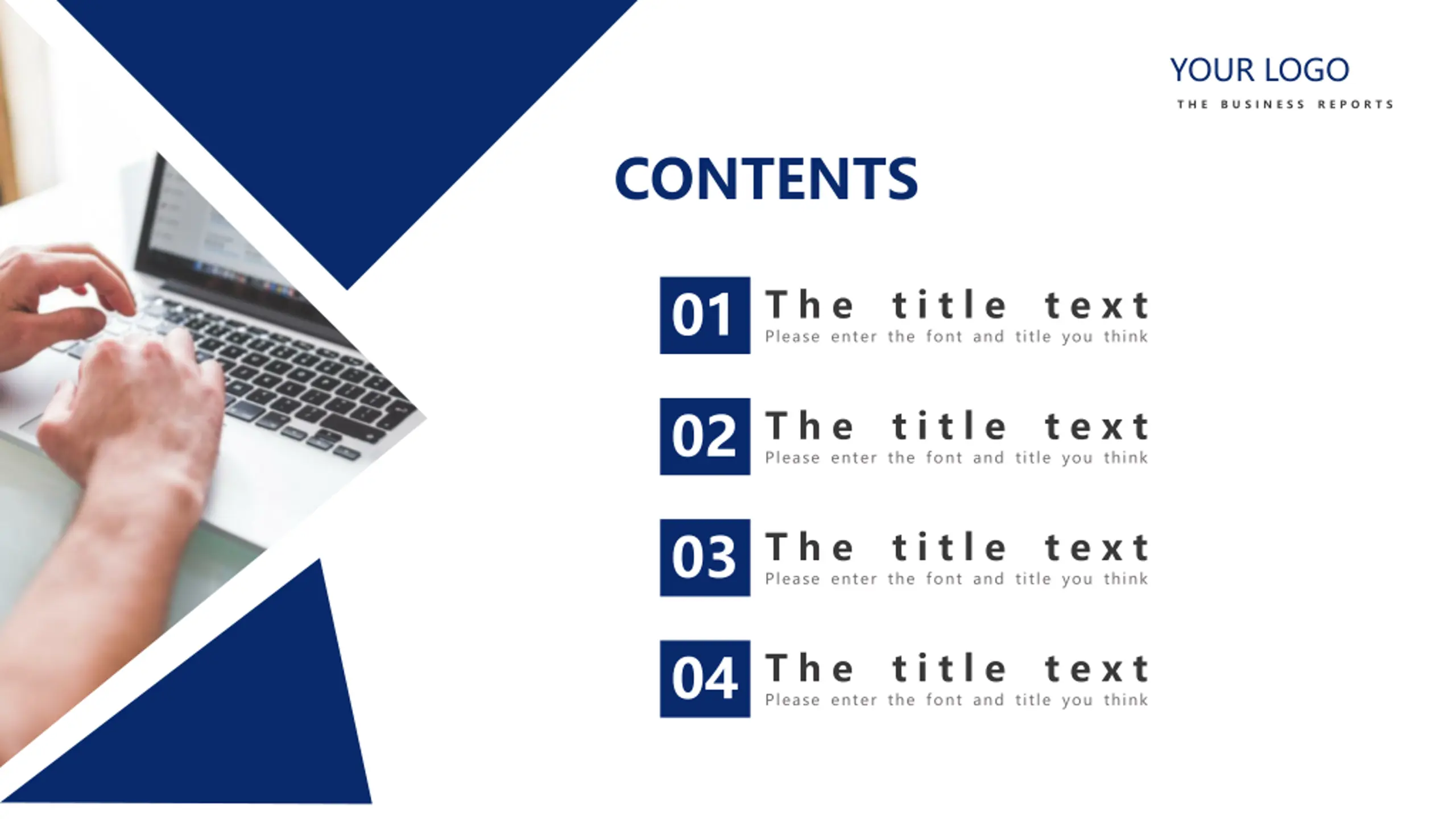 YOUR LOGO T H E B U S I N E S S R E P O R T S CONTENTS 01T h e t i t l e t e x t Please enter the font and title you think 02T h e t i t l e t e x t Please enter the font and title you think 03T h e t i t l e t e x t Please enter the font and title you think 04T h e t i t l e t e x t Please enter the font and title you think