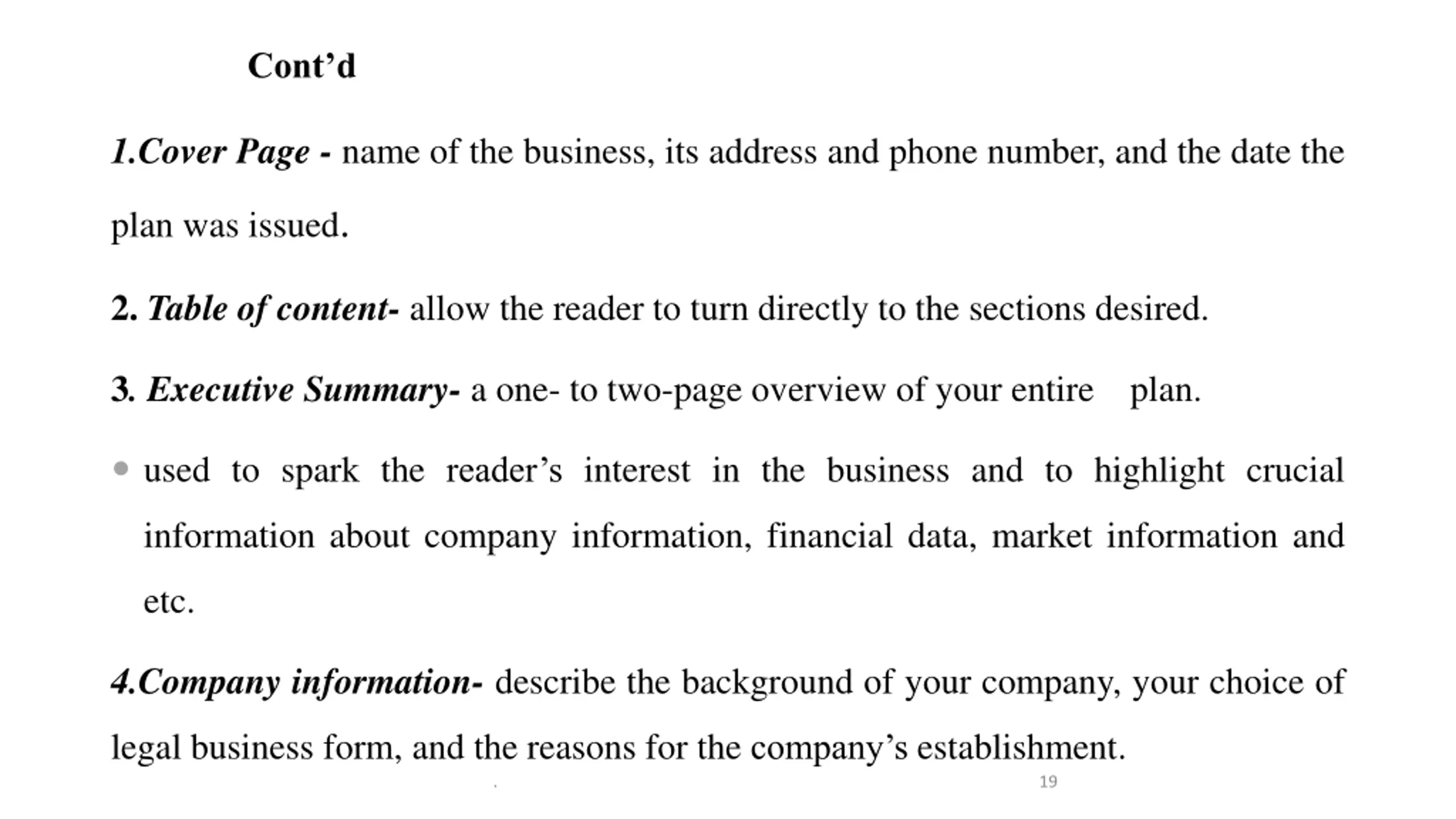 Contd 1.Cover Page - name of the business, its address and phone number, and the date the plan was issued. 2. Table of content- allow the reader to turn directly to the sections desired. 3. Executive Summary- a one- to two-page overview of your entire plan. used to spark the reader s interest in the business and to highlight crucial information about company information, financial data, market information and etc. 4.Company information- describe the background of your company, your choice of legal business form, and the reasons for the company s establishment. . 19