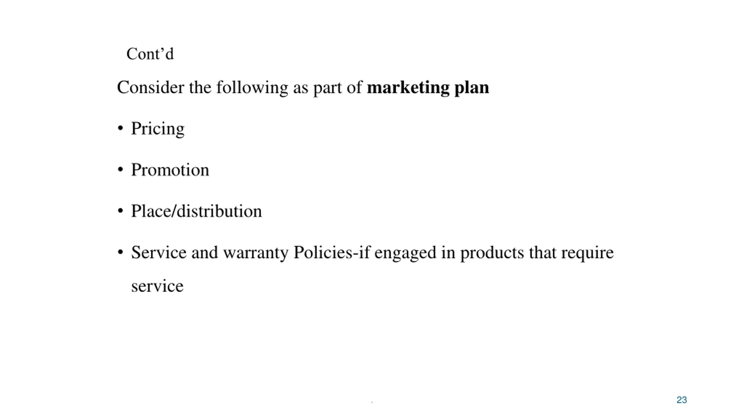 Contd Consider the following as part of marketing plan Pricing Promotion Place/distribution Service and warranty Policies-if engaged in products that require service 23 .