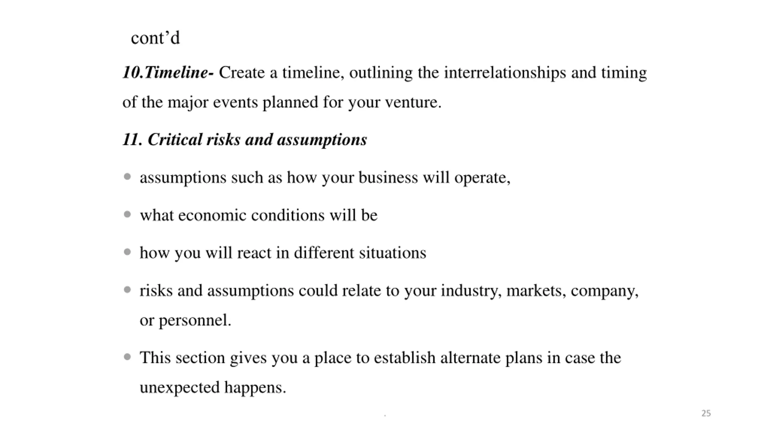 contd 10.Timeline- Create a timeline, outlining the interrelationships and timing of the major events planned for your venture. 11. Critical risks and assumptions assumptions such as how your business will operate, what economic conditions will be how you will react in different situations risks and assumptions could relate to your industry, markets, company, or personnel. This section gives you a place to establish alternate plans in case the unexpected happens. . 25