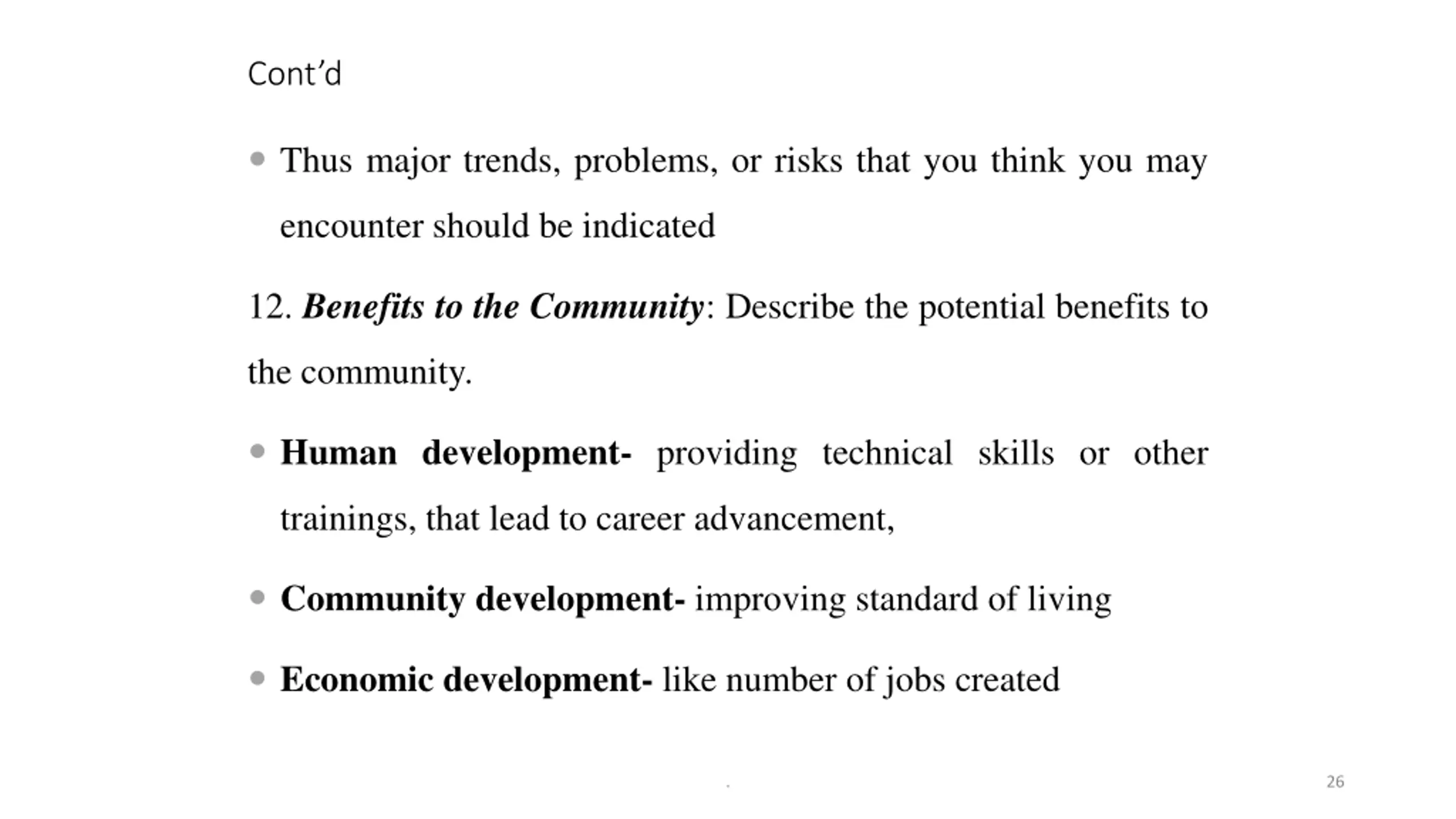 Contd Thus major trends, problems, or risks that you think you may encounter should be indicated 12. Benefits to the Community: Describe the potential benefits to the community. Human development- providing technical skills or other trainings, that lead to career advancement, Community development- improving standard of living Economic development- like number of jobs created . 26
