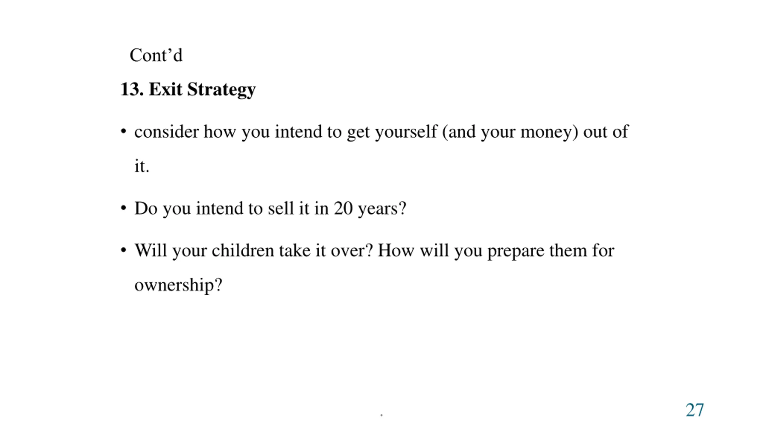 Contd 13. Exit Strategy consider how you intend to get yourself (and your money) out of it. Do you intend to sell it in 20 years? Will your children take it over? How will you prepare them for ownership? . 27