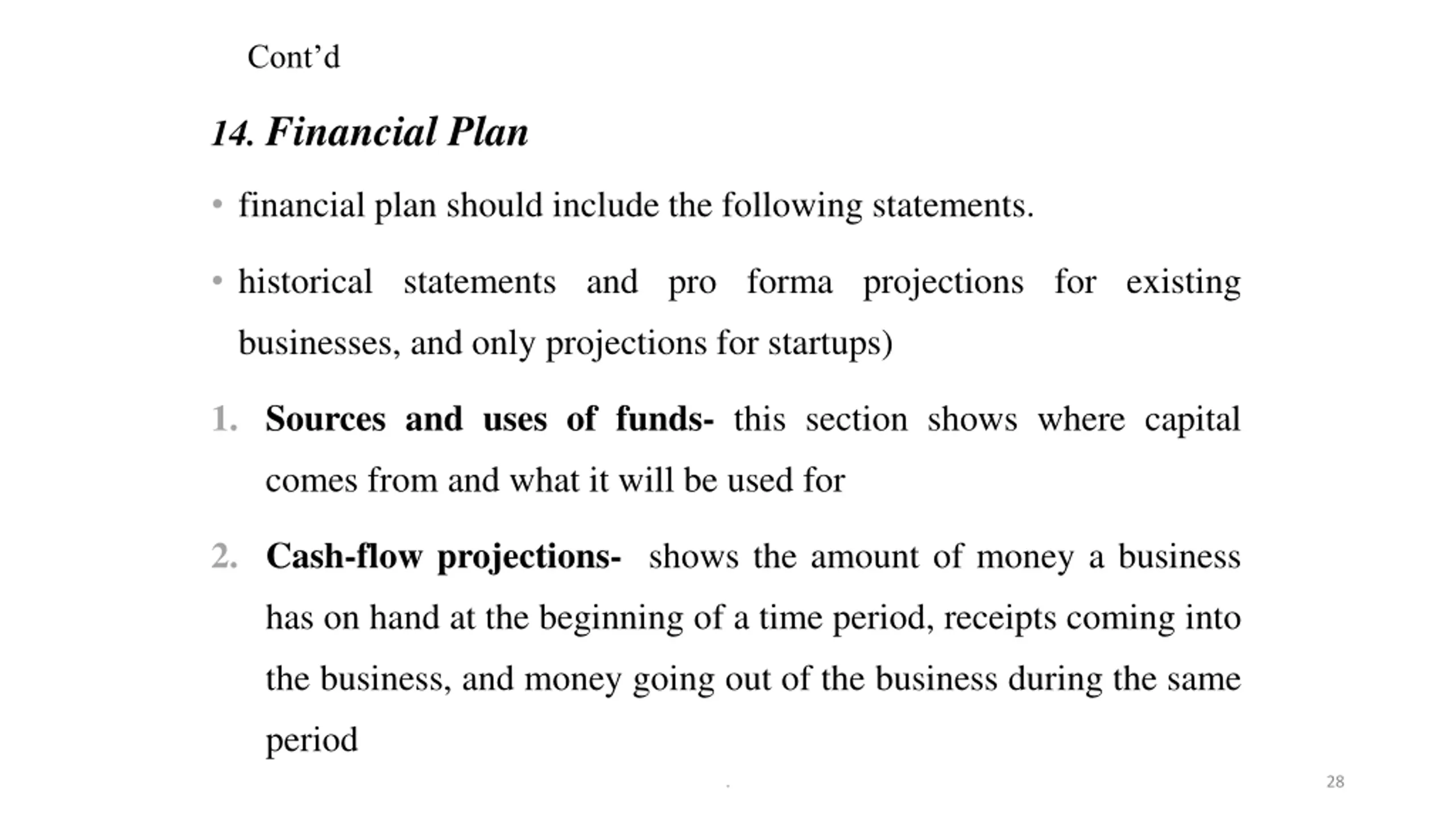 Contd 14. Financial Plan financial plan should include the following statements. historical statements and pro forma projections for existing businesses, and only projections for startups) 1. Sources and uses of funds- this section shows where capital comes from and what it will be used for 2. Cash-flow projections- shows the amount of money a business has on hand at the beginning of a time period, receipts coming into the business, and money going out of the business during the same period . 28