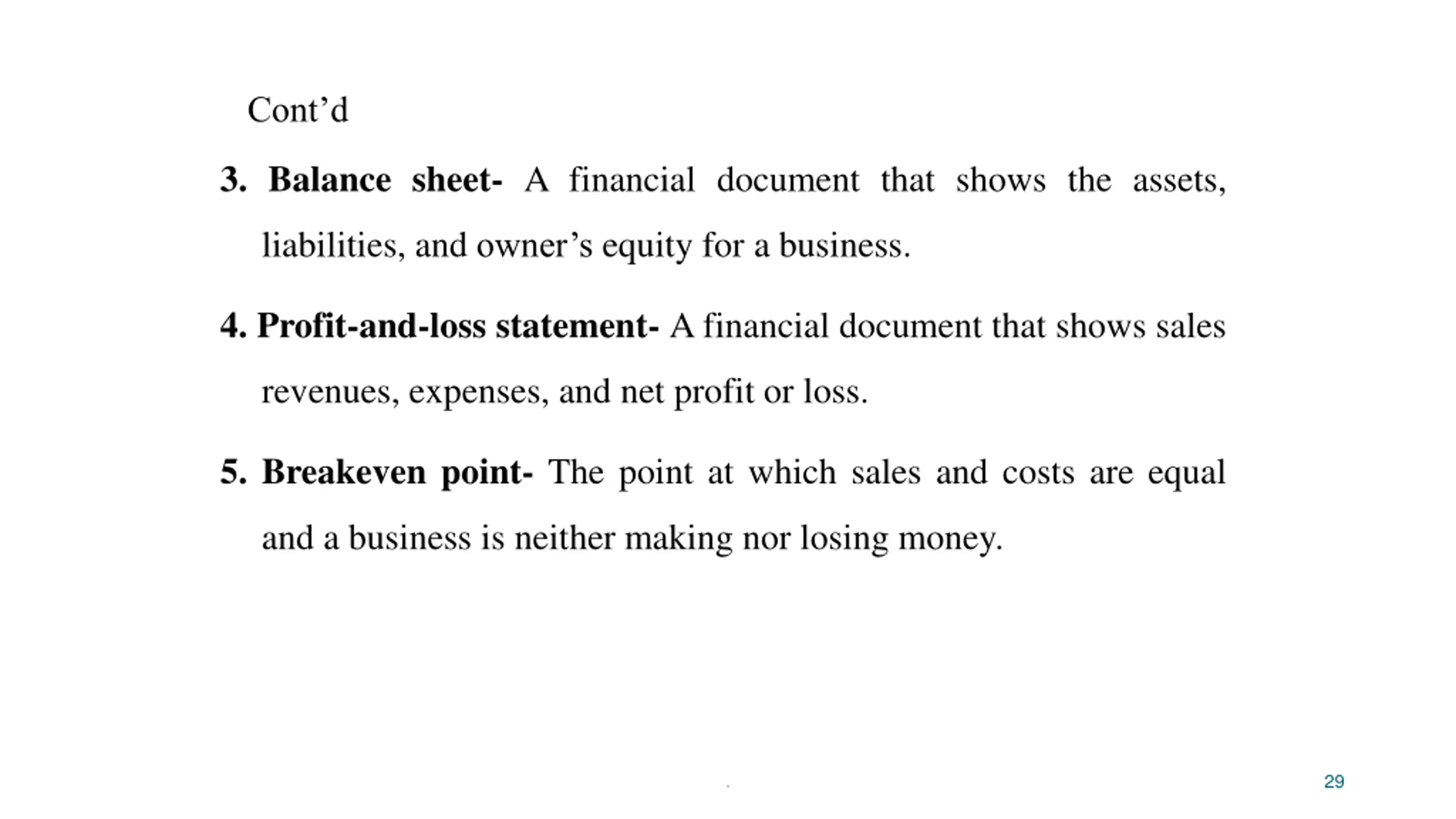 Contd 3. Balance sheet- A financial document that shows the assets, liabilities, and owner s equity for a business. 4. Profit-and-loss statement- A financial document that shows sales revenues, expenses, and net profit or loss. 5. Breakeven point- The point at which sales and costs are equal and a business is neither making nor losing money. 29 .