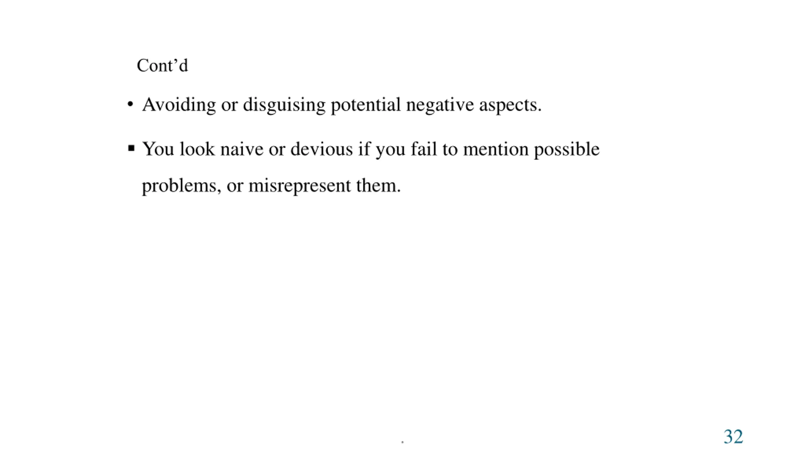Contd Avoiding or disguising potential negative aspects. You look naive or devious if you fail to mention possible problems, or misrepresent them. . 32