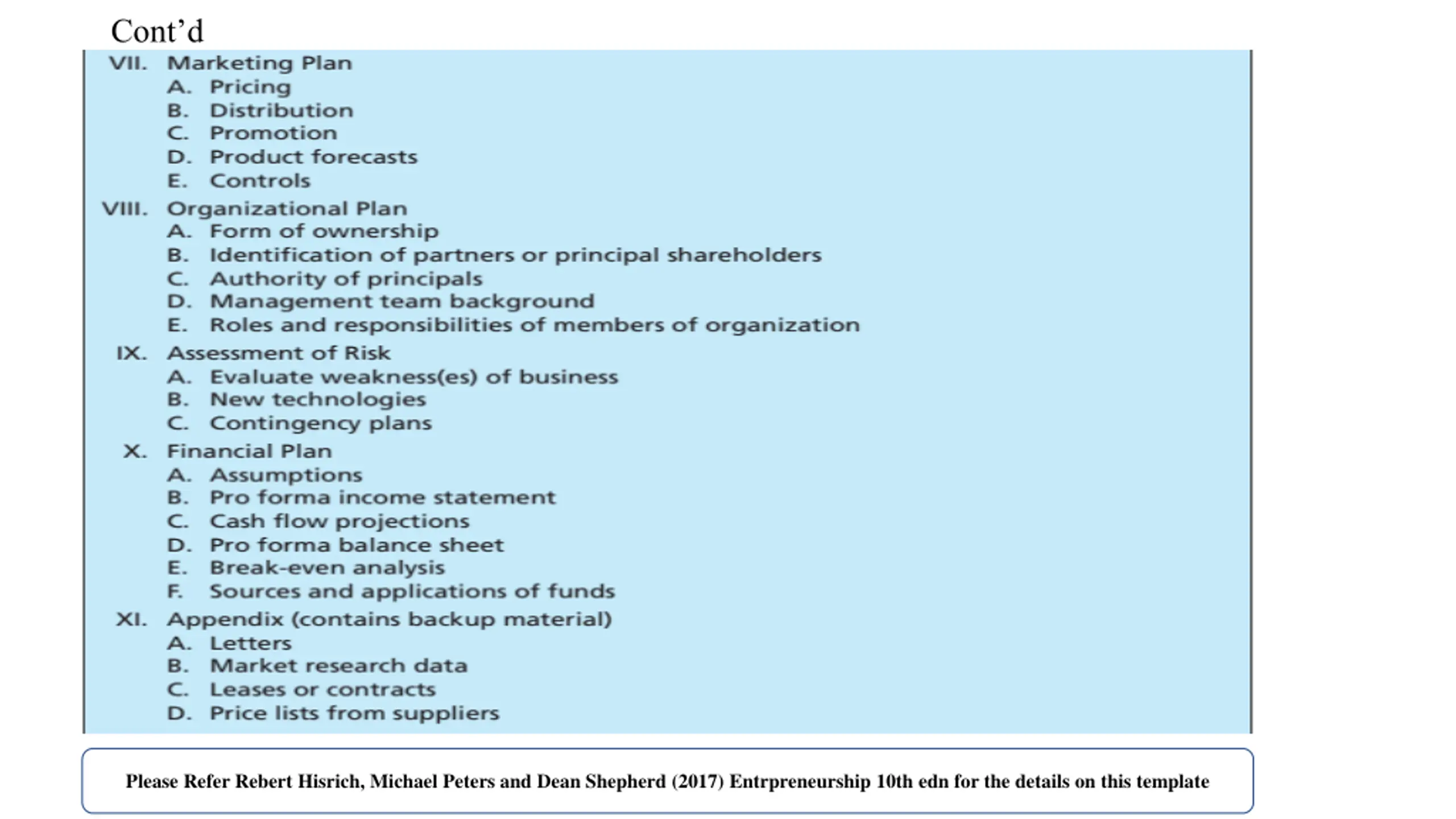 Contd Please Refer Rebert Hisrich, Michael Peters and Dean Shepherd (2017) Entrpreneurship 10th edn for the details on this template