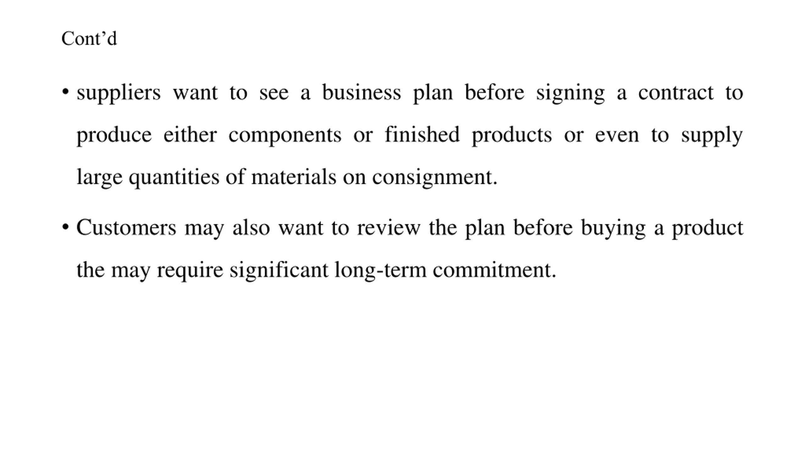 Contd suppliers want to see a business plan before signing a contract to produce either components or finished products or even to supply large quantities of materials on consignment. Customers may also want to review the plan before buying a product the may require significant long-term commitment.