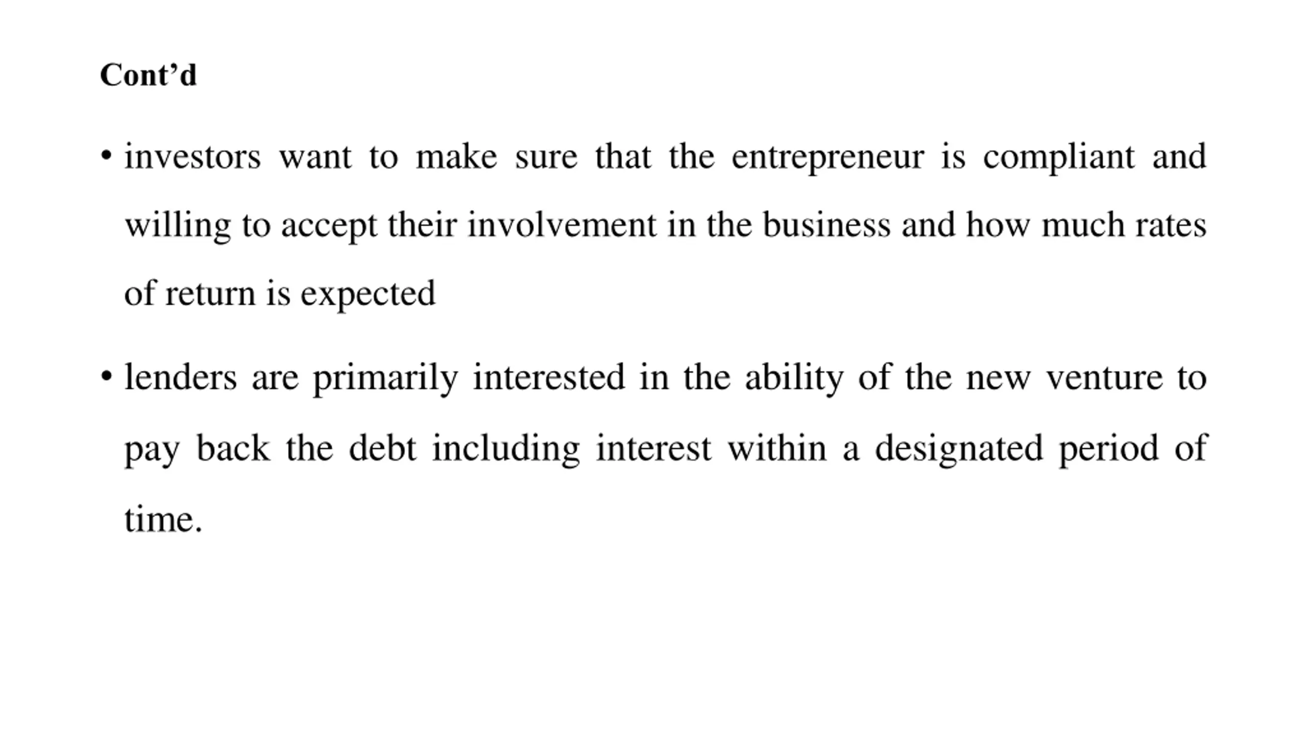 Contd investors want to make sure that the entrepreneur is compliant and willing to accept their involvement in the business and how much rates of return is expected lenders are primarily interested in the ability of the new venture to pay back the debt including interest within a designated period of time.