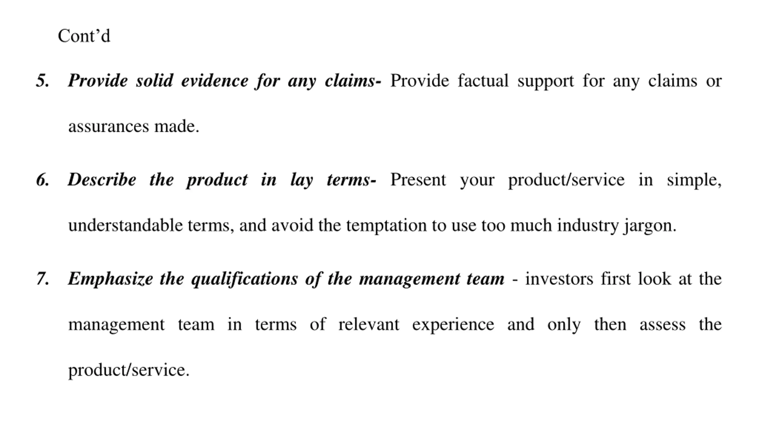 Contd 5. Provide solid evidence for any claims- Provide factual support for any claims or assurances made. 6. Describe the product in lay terms- Present your product/service in simple, understandable terms, and avoid the temptation to use too much industry jargon. 7. Emphasize the qualifications of the management team - investors first look at the management team in terms of relevant experience and only then assess the product/service.