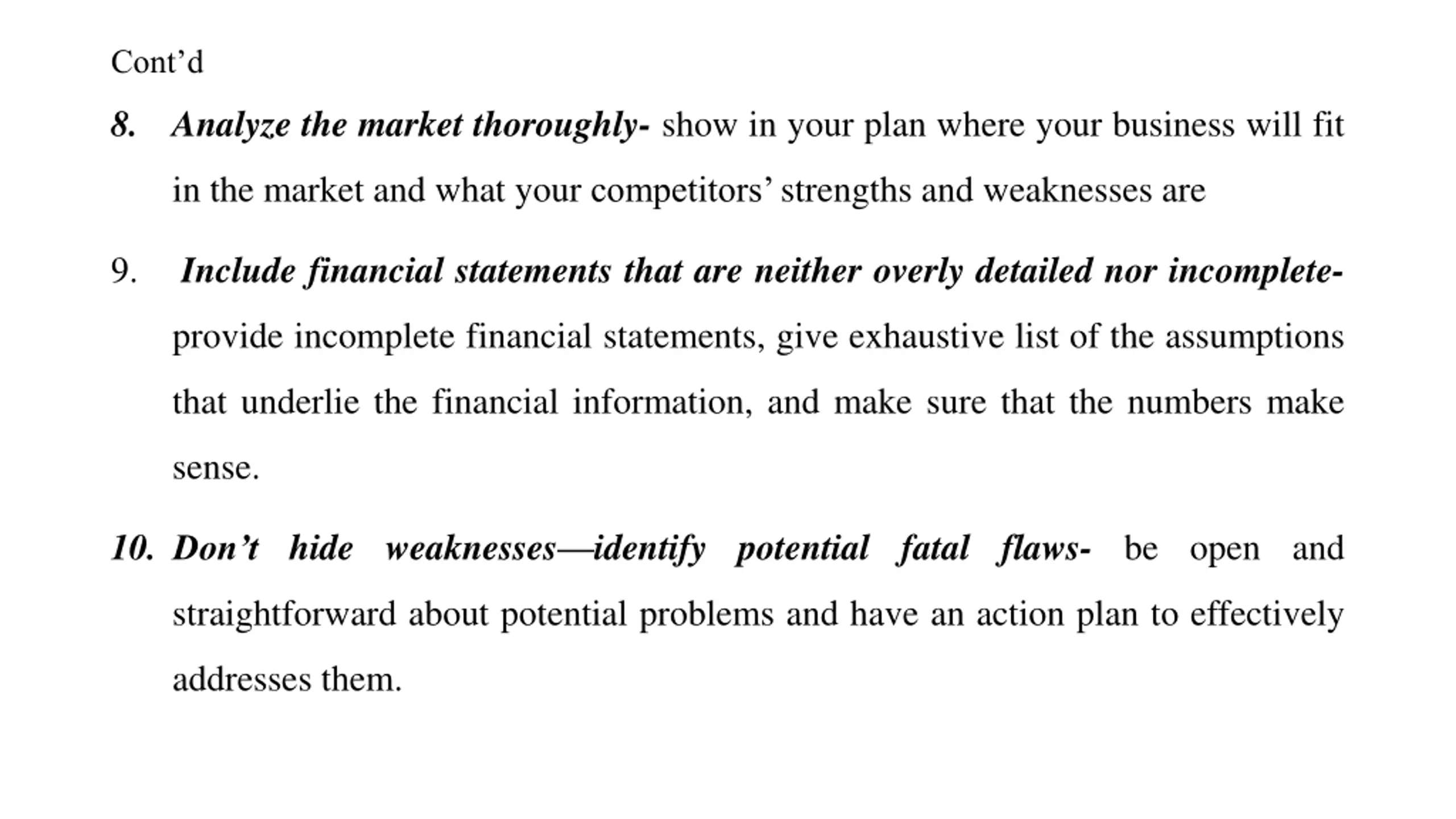 Contd 8. Analyze the market thoroughly- show in your plan where your business will fit in the market and what your competitors strengths and weaknesses are Include financial statements that are neither overly detailed nor incomplete- 9. provide incomplete financial statements, give exhaustive list of the assumptions that underlie the financial information, and make sure that the numbers make sense. 10. Don t hide weaknesses identify potential fatal flaws- be open and straightforward about potential problems and have an action plan to effectively addresses them.