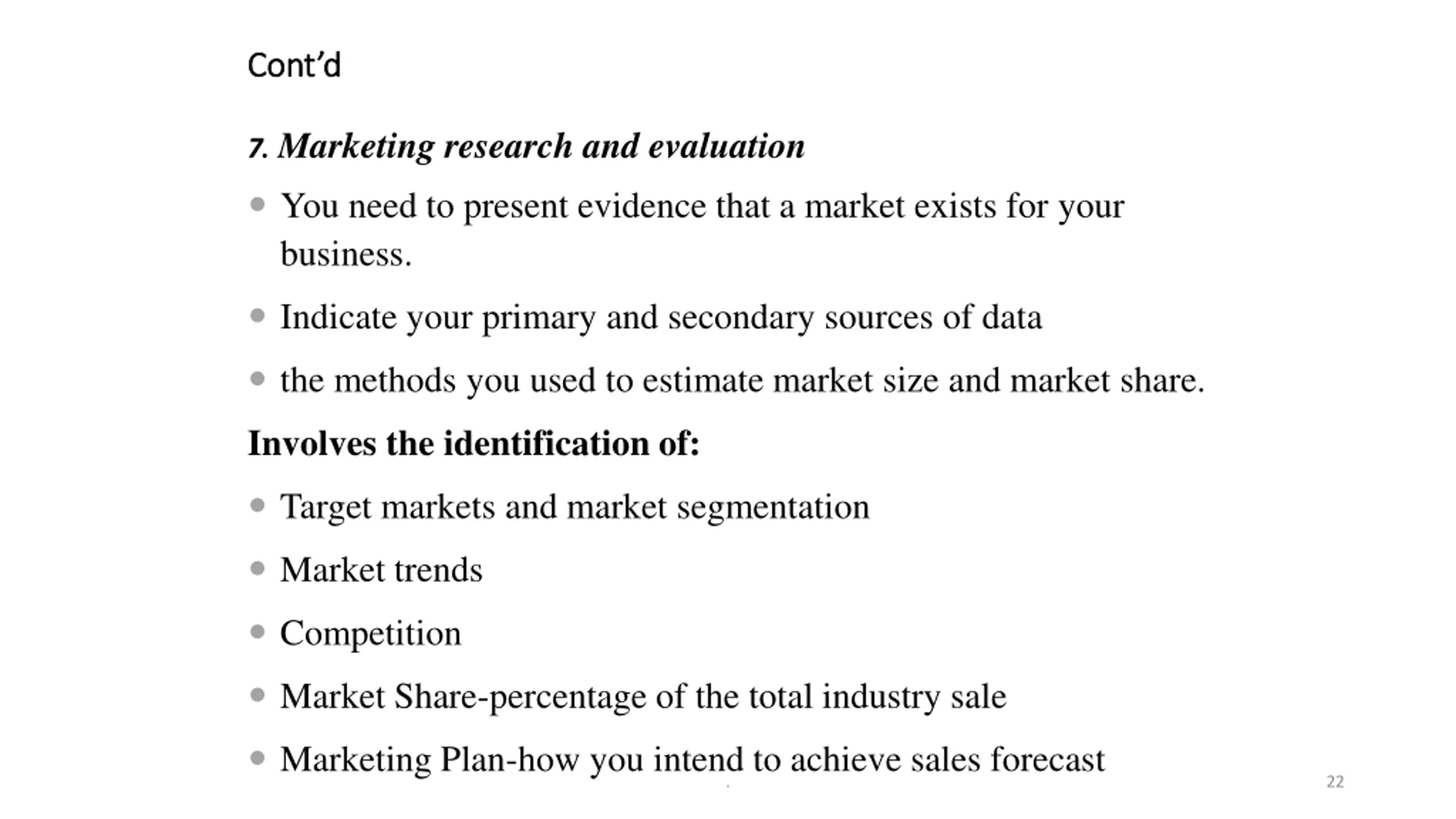 Contd Cont d 7. Marketing research and evaluation You need to present evidence that a market exists for your business. Indicate your primary and secondary sources of data the methods you used to estimate market size and market share. Involves the identification of: Target markets and market segmentation Market trends Competition Market Share-percentage of the total industry sale Marketing Plan-how you intend to achieve sales forecast . 22
