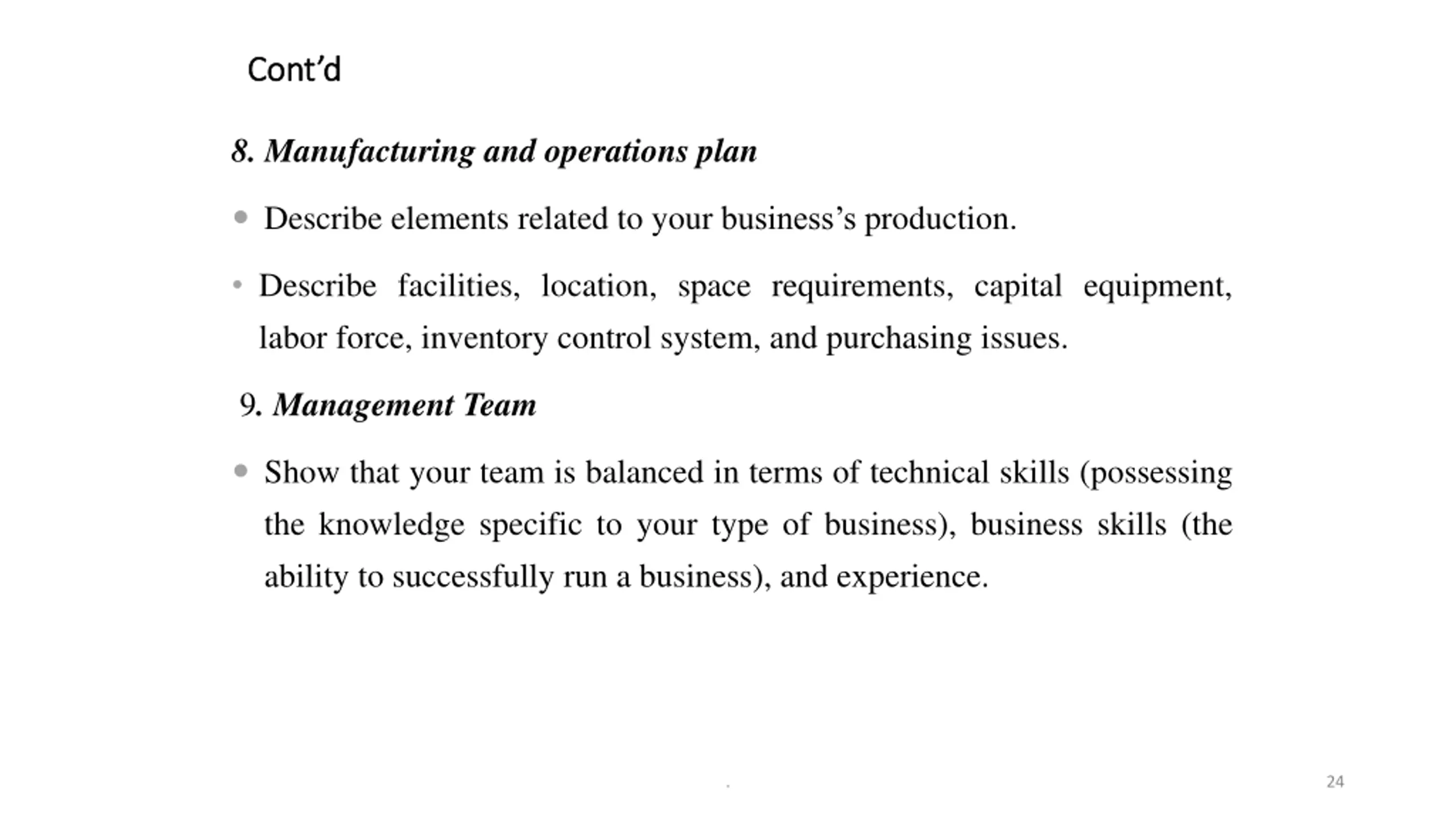 Contd Cont d 8. Manufacturing and operations plan Describe elements related to your business s production. Describe facilities, location, space requirements, capital equipment, labor force, inventory control system, and purchasing issues. 9. Management Team Show that your team is balanced in terms of technical skills (possessing the knowledge specific to your type of business), business skills (the ability to successfully run a business), and experience. . 24