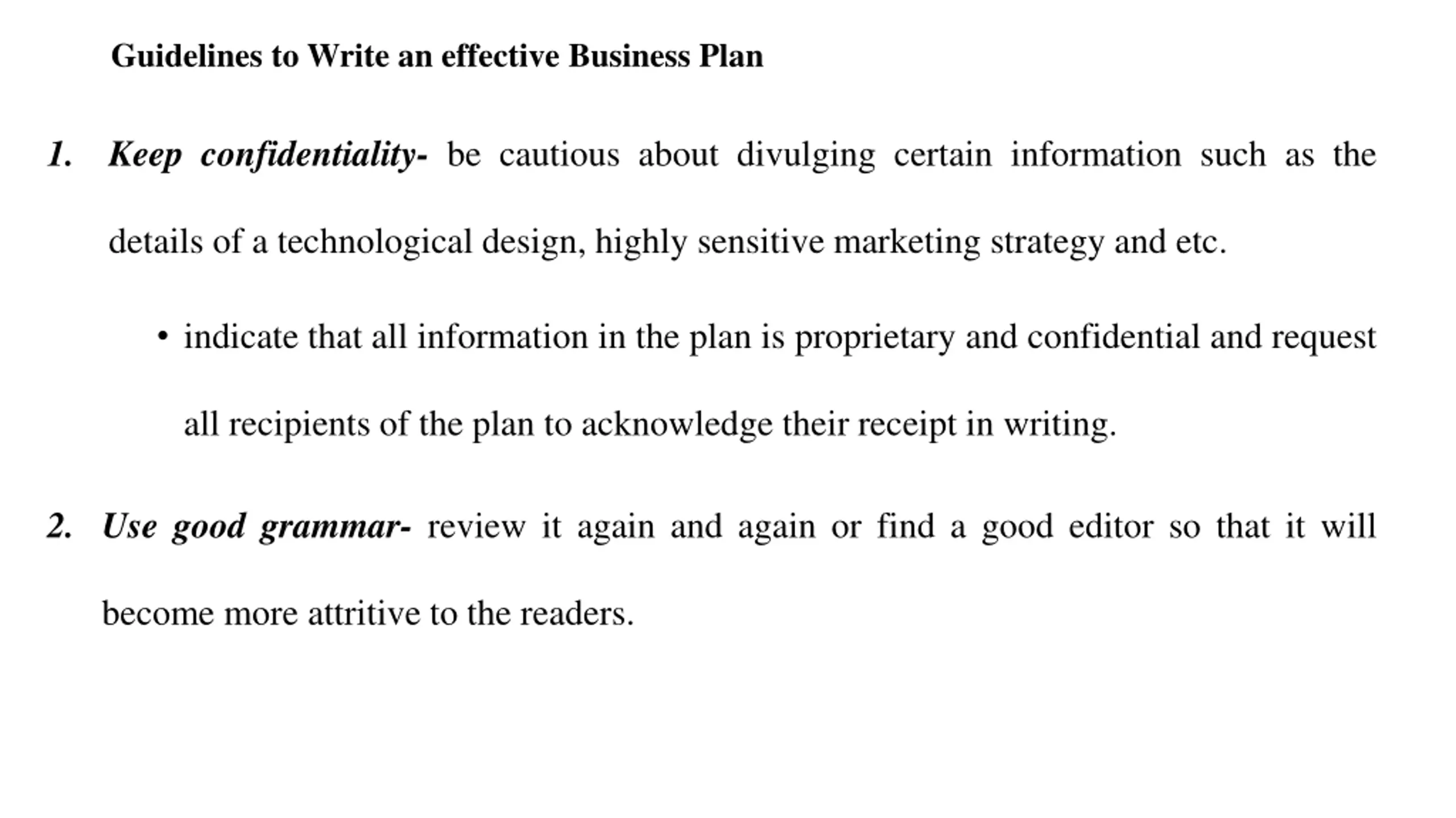 Guidelines to Write an effective Business Plan 1. Keep confidentiality- be cautious about divulging certain information such as the details of a technological design, highly sensitive marketing strategy and etc. indicate that all information in the plan is proprietary and confidential and request all recipients of the plan to acknowledge their receipt in writing. 2. Use good grammar- review it again and again or find a good editor so that it will become more attritive to the readers.