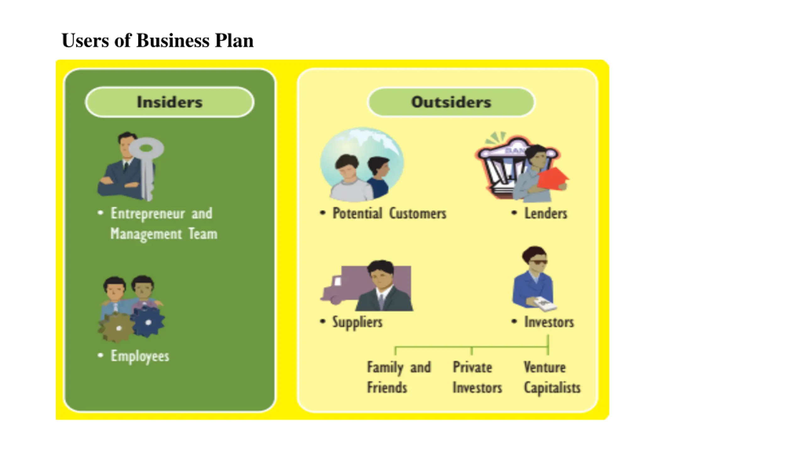 Business plan helps the insiders and outsiders in the following ways helps the entrepreneur and the management team focus on important issues and activities for the new venture helps the entrepreneur communicate his or her vision to current and prospective employees of the firm Helps them to convince the outsiders Help the employees to understand the goals and objectives of the business and what is expected of them to realize the goals