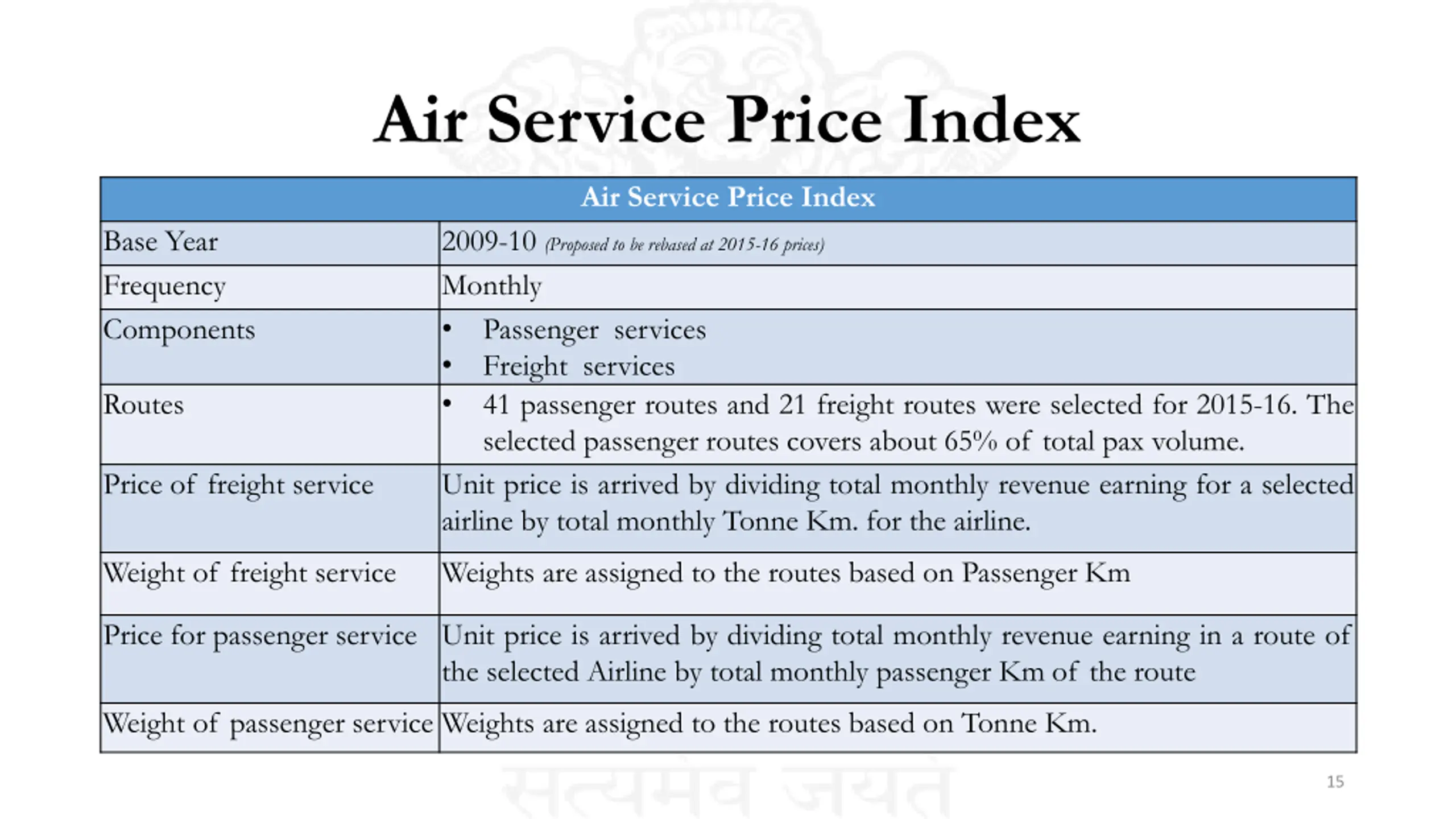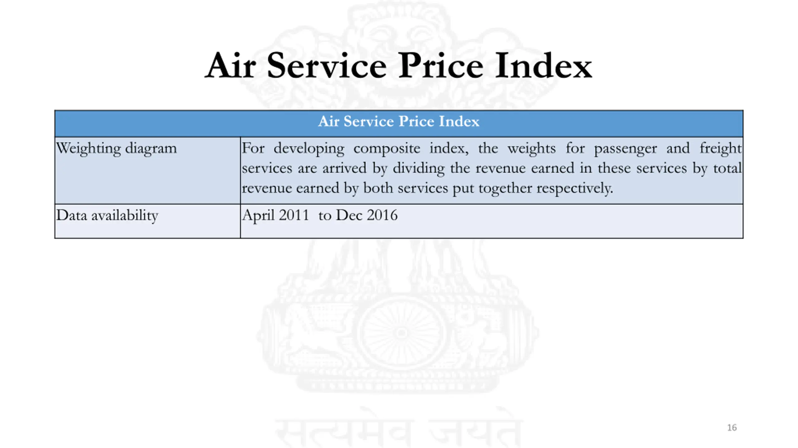 Air Service Price Index Air Service Price Index For developing composite index, the weights for passenger and freight services are arrived by dividing the revenue earned in these services by total revenue earned by both services put together respectively. Weighting diagram Data availability April 2011 to Dec 2016 16
