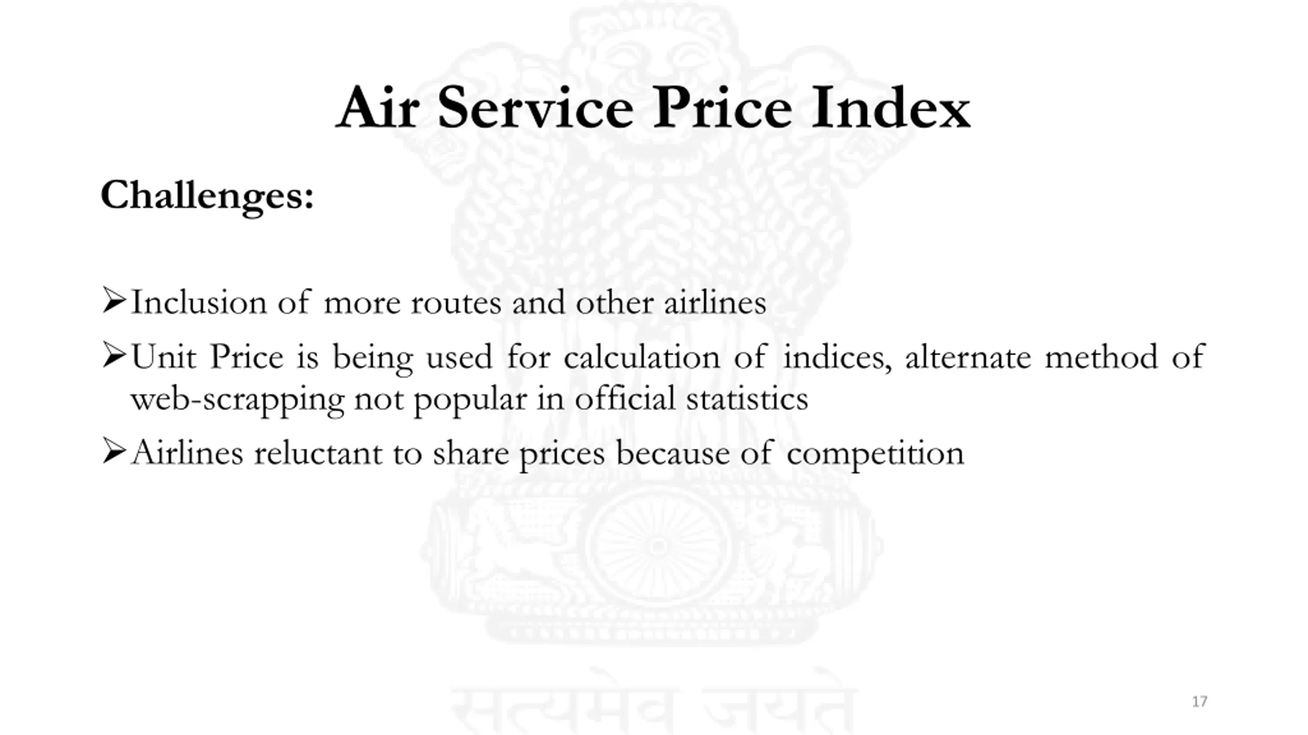 Air Service Price Index Challenges: Inclusion of more routes and other airlines Unit Price is being used for calculation of indices, alternate method of web-scrapping not popular in official statistics Airlines reluctant to share prices because of competition 17