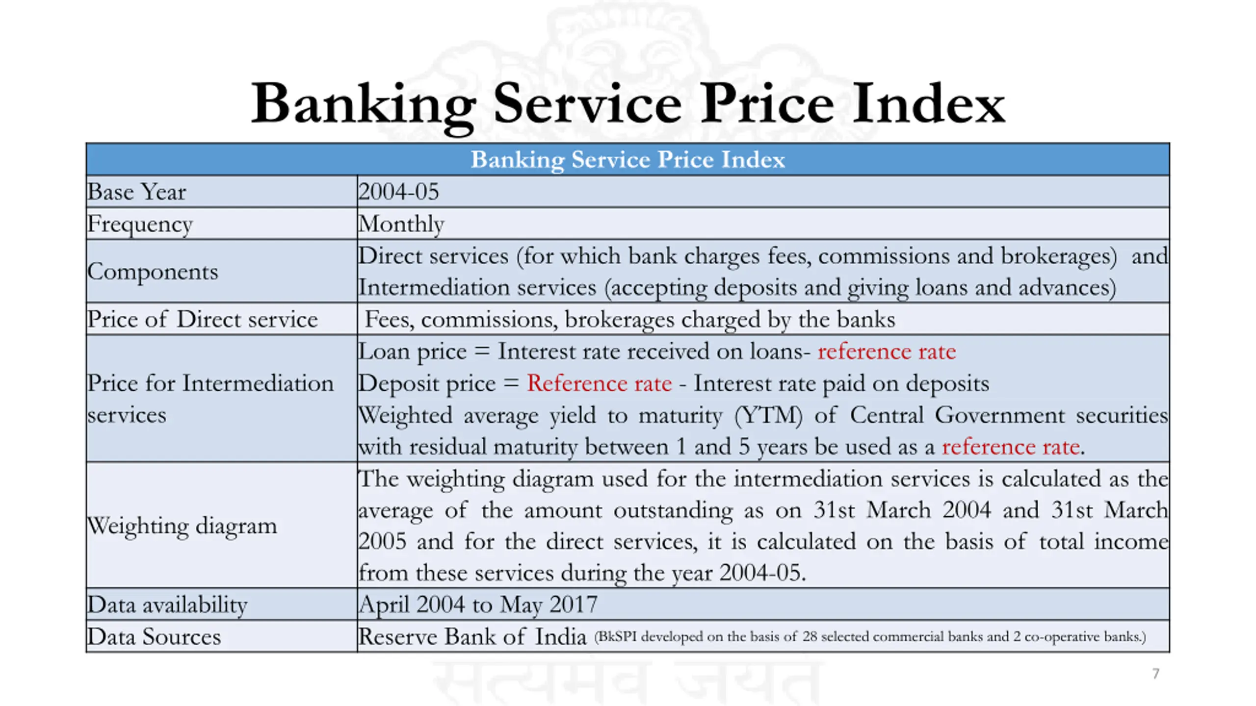 Banking Service Price Index Banking Service Price Index 2004-05 Monthly Direct services (for which bank charges fees, commissions and brokerages) and Intermediation services (accepting deposits and giving loans and advances) Price of Directservice Fees, commissions, brokerages charged by the banks Loan price = Interest rate received on loans- reference rate Deposit price = Reference rate - Interest rate paid on deposits Weighted average yield to maturity (YTM) of Central Government securities with residual maturity between 1 and 5 years be used as a reference rate. The weighting diagram used for the intermediation services is calculated as the average of the amount outstanding as on 31st March 2004 and 31st March 2005 and for the direct services, it is calculated on the basis of total income from these services during the year 2004-05. Data availability April 2004 to May 2017 Data Sources Reserve Bank of India (BkSPI developed on the basis of 28 selected commercial banks and 2 co-operative banks.) Base Year Frequency Components Price for Intermediation services Weighting diagram 7