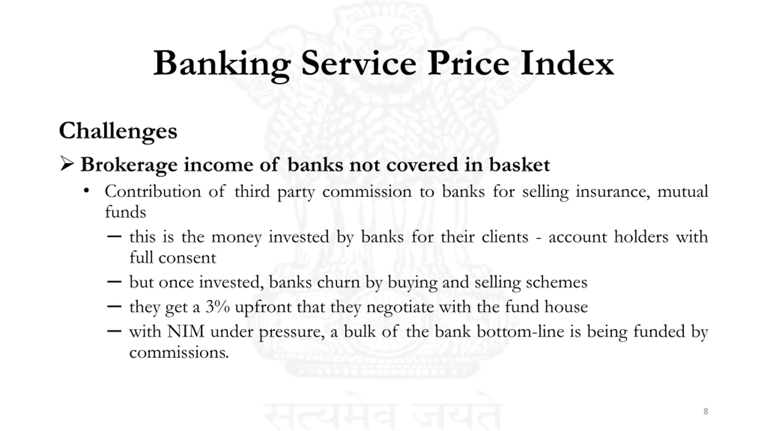 Banking Service Price Index Challenges Brokerage income of banks not covered in basket Contribution of third party commission to banks for selling insurance, mutual funds this is the money invested by banks for their clients - account holders with full consent but once invested, banks churn by buying and selling schemes they get a 3% upfront that they negotiate with the fund house with NIM under pressure, a bulk of the bank bottom-line is being funded by commissions. 8