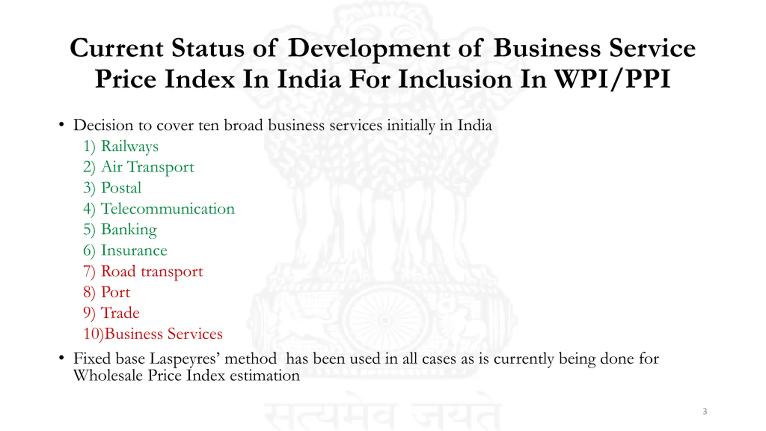 Current Status of Development of Business Service Price Index In India For Inclusion In WPI/PPI Decision to cover ten broad business services initially in India 1) Railways 2) Air Transport 3) Postal 4) Telecommunication 5) Banking 6) Insurance 7) Road transport 8) Port 9) Trade 10)Business Services Fixed base Laspeyres method has been used in all cases as is currently being done for Wholesale Price Index estimation 3