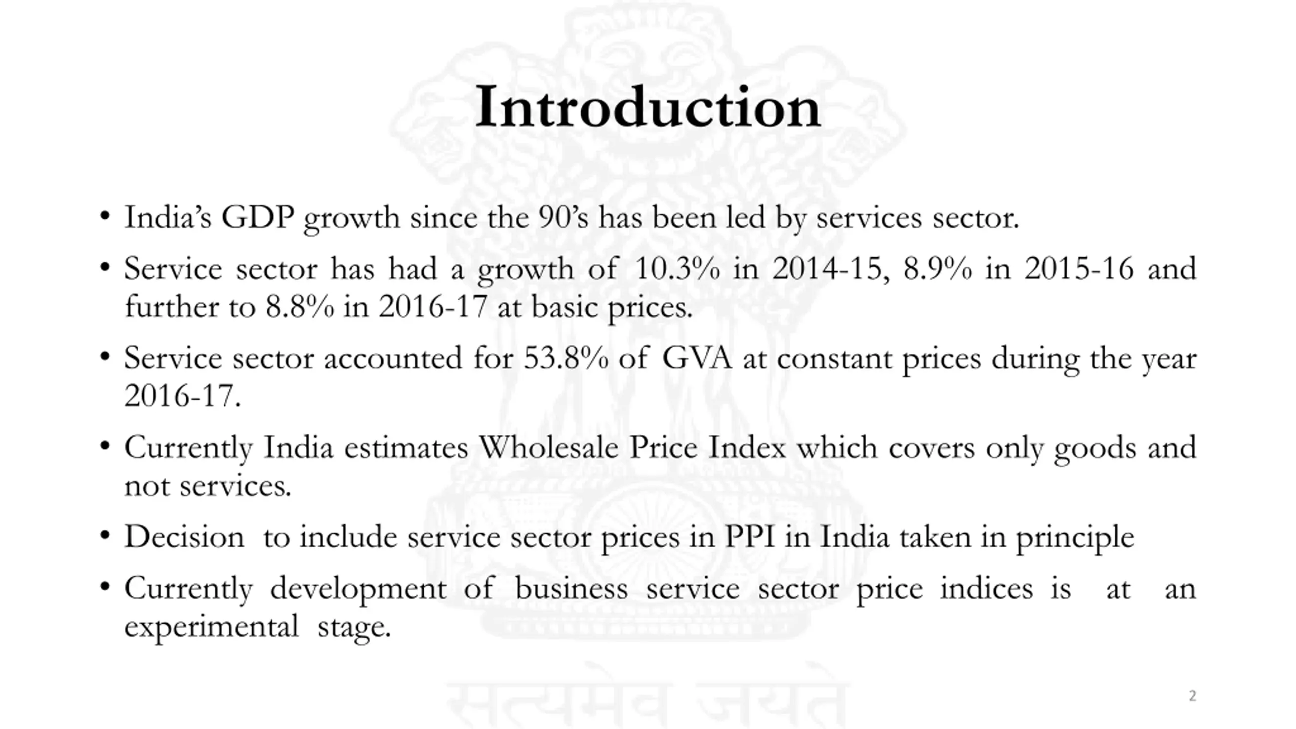 Introduction India s GDP growth since the 90 s has been led by services sector. Service sector has had a growth of 10.3% in 2014-15, 8.9% in 2015-16 and further to 8.8% in 2016-17 at basic prices. Service sector accounted for 53.8% of GVA at constant prices during the year 2016-17. Currently India estimates Wholesale Price Index which covers only goods and not services. Decision to include service sector prices in PPI in India taken in principle Currently development of business service sector price indices is experimental stage. at an 2