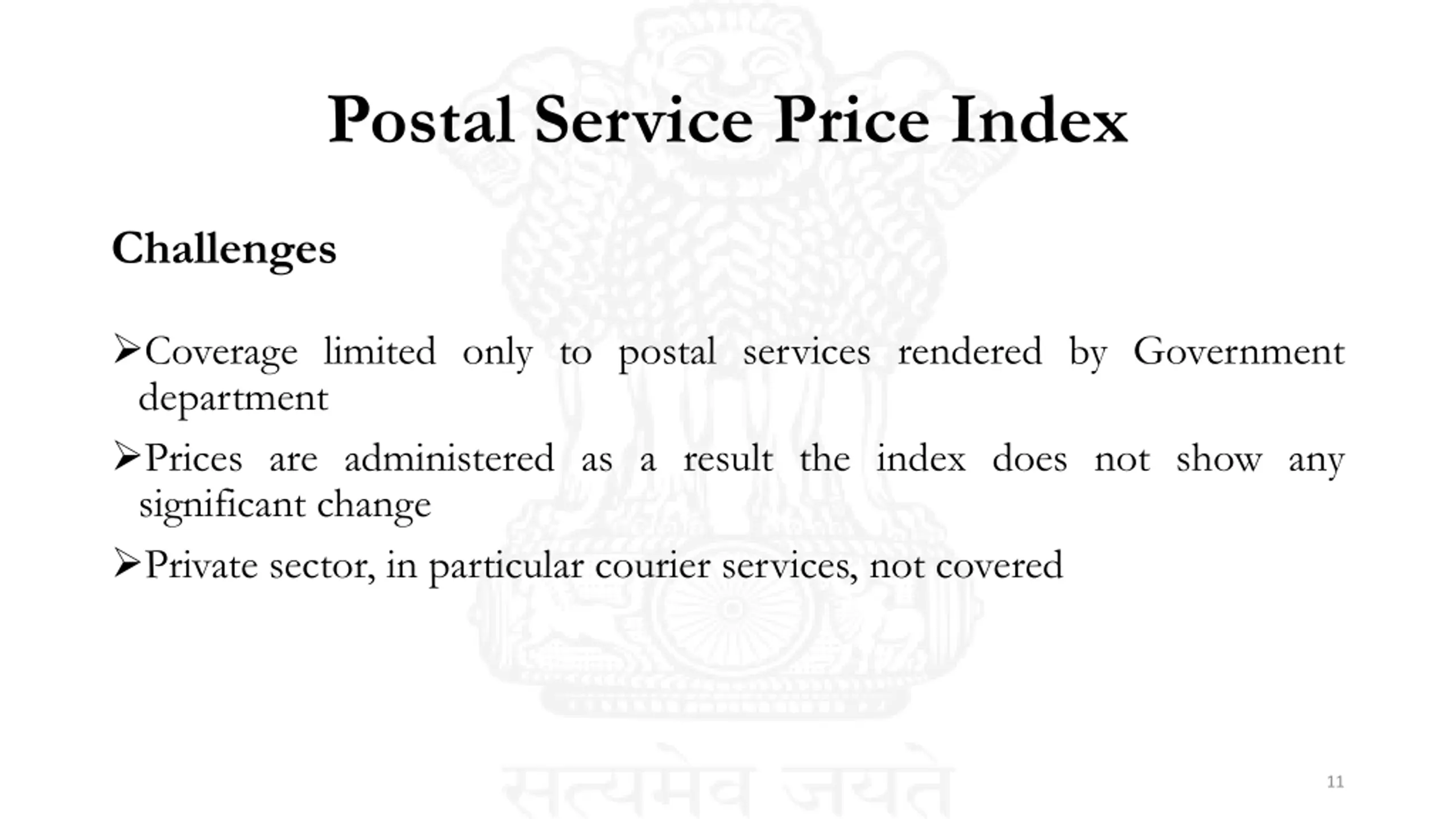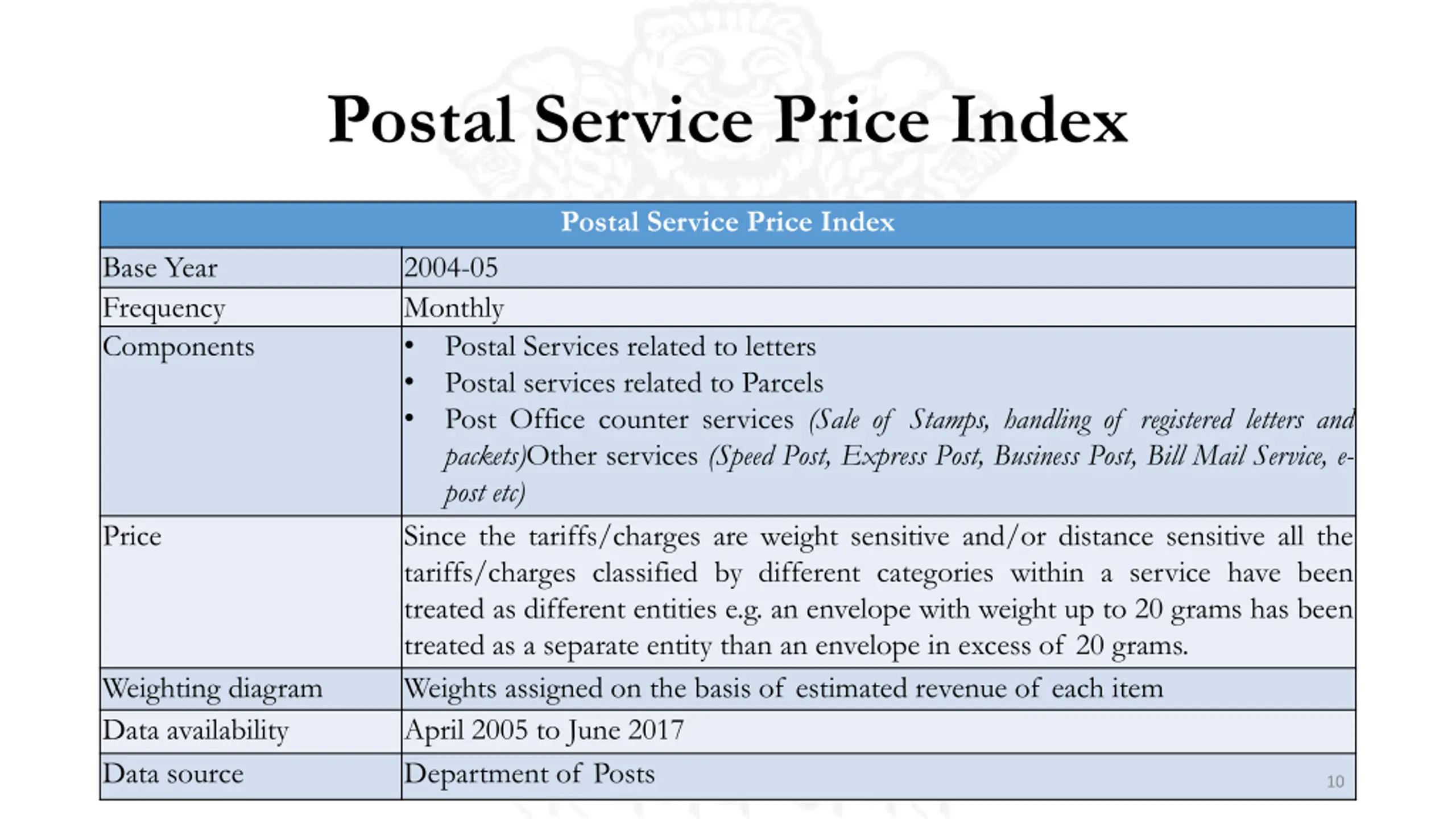 Postal Service Price Index Postal Service Price Index Base Year Frequency Components 2004-05 Monthly Postal Services related to letters Postal services related to Parcels Post Office counter services (Sale of Stamps, handling of registered letters and packets)Other services (Speed Post, Express Post, Business Post, Bill Mail Service, e- post etc) Since the tariffs/charges are weight sensitive and/or distance sensitive all the tariffs/charges classified by different categories within a service have been treated as different entities e.g. an envelope with weight up to 20 grams has been treated as a separate entity than an envelope in excess of 20 grams. Weights assigned on the basis of estimated revenue of each item April 2005 to June 2017 Department of Posts Price Weighting diagram Data availability Data source 10