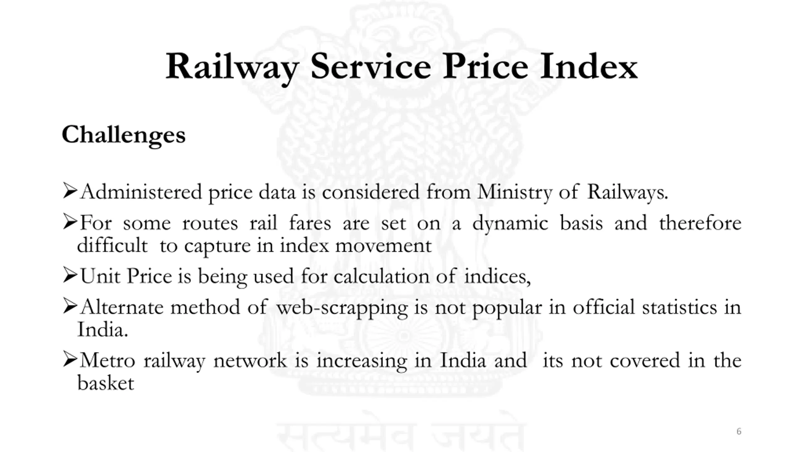 Railway Service Price Index Challenges Administered price data is considered from Ministry of Railways. For some routes rail fares are set on a dynamic basis and therefore difficult to capture in index movement Unit Price is being used for calculation of indices, Alternate method of web-scrapping is not popular in official statistics in India. Metro railway network is increasing in India and its not covered in the basket 6