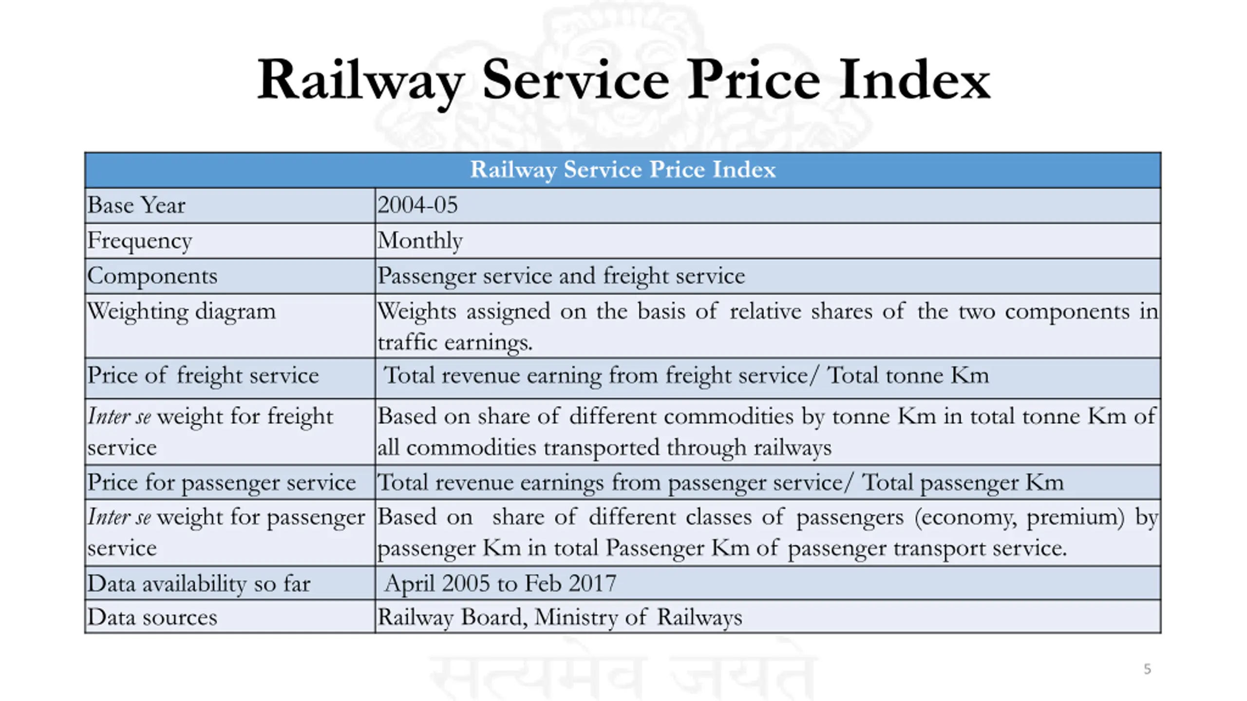 Railway Service Price Index Railway Service Price Index Base Year Frequency Components Weighting diagram 2004-05 Monthly Passenger service and freight service Weights assigned on the basis of relative shares of the two components in traffic earnings. Total revenue earning from freight service/ Total tonne Km Based on share of different commodities by tonne Km in total tonne Km of all commodities transported through railways Price for passenger service Total revenue earnings from passenger service/ Total passenger Km Inter se weight for passenger service passenger Km in total Passenger Km of passenger transport service. Data availability so far April 2005 to Feb 2017 Data sources Railway Board, Ministry of Railways Price of freight service Inter se weight for freight service Based on share of different classes of passengers (economy, premium) by 5